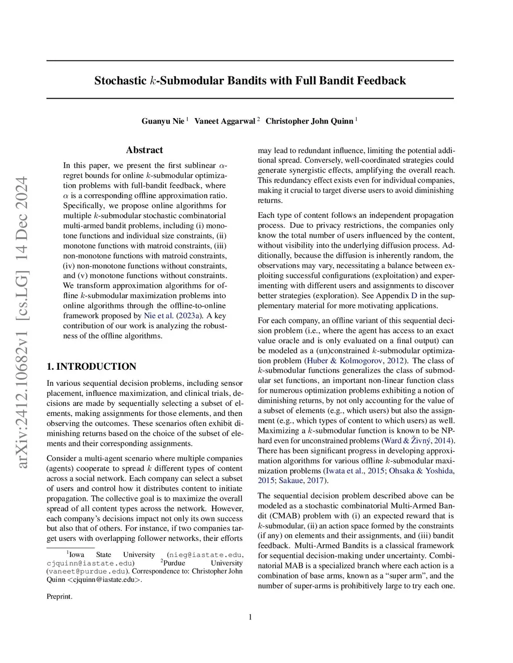 Stochastic -Submodular Bandits with Full Bandit Feedback