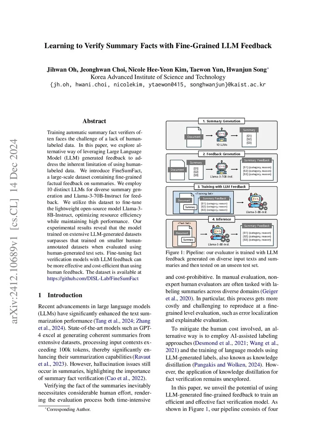Training automatic summary fact verifiers often faces the challenge of a lack of human-labeled data. In this paper, we explore alternative way of leveraging Large Language Model (LLM) generated feedback to address the inherent limitation of using human-labeled data. We introduce FineSumFact, a large-scale dataset containing fine-grained factual feedback on summaries. We employ 10 distinct LLMs for diverse summary generation and Llama-3-70B-Instruct for feedback. We utilize this dataset to fine-tune the lightweight open-source model Llama-3-8B-Instruct, optimizing resource efficiency while maintaining high performance. Our experimental results reveal that the model trained on extensive LLM-generated datasets surpasses that trained on smaller human-annotated datasets when evaluated using human-generated test sets. Fine-tuning fact verification models with LLM feedback can be more effective and cost-efficient than using human feedback. The dataset is available at https://github.com/DISL-Lab/FineSumFact.