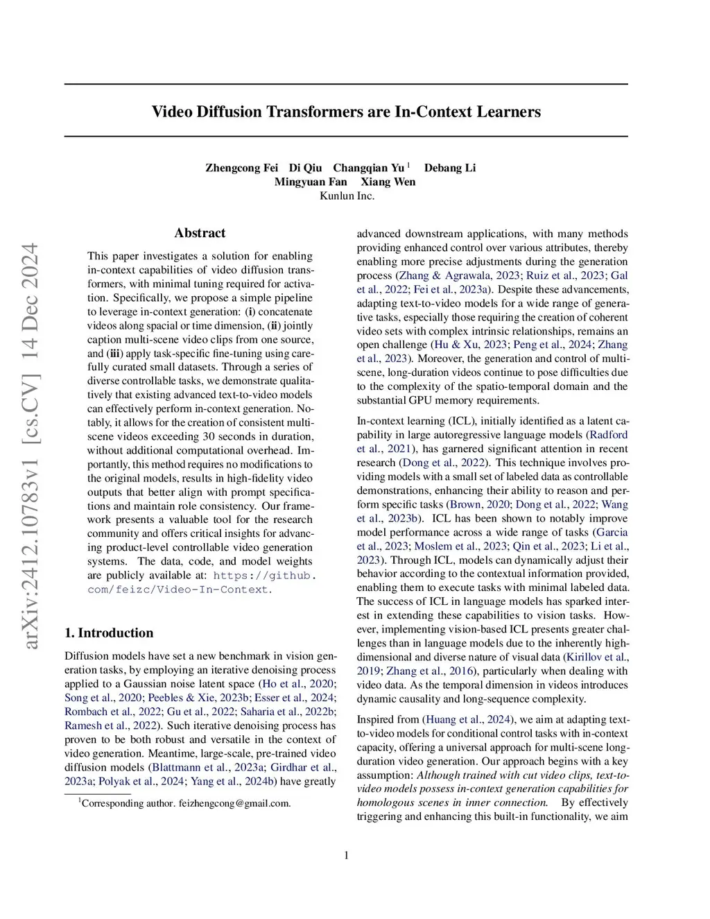 This paper investigates a solution for enabling in-context capabilities of video diffusion transformers, with minimal tuning required for activation. Specifically, we propose a simple pipeline to leverage in-context generation: () concatenate videos along spacial or time dimension, () jointly caption multi-scene video clips from one source, and () apply task-specific fine-tuning using carefully curated small datasets. Through a series of diverse controllable tasks, we demonstrate qualitatively that existing advanced text-to-video models can effectively perform in-context generation. Notably, it allows for the creation of consistent multi-scene videos exceeding 30 seconds in duration, without additional computational overhead. Importantly, this method requires no modifications to the original models, results in high-fidelity video outputs that better align with prompt specifications and maintain role consistency. Our framework presents a valuable tool for the research community and offers critical insights for advancing product-level controllable video generation systems. The data, code, and model weights are publicly available at:this https URL.