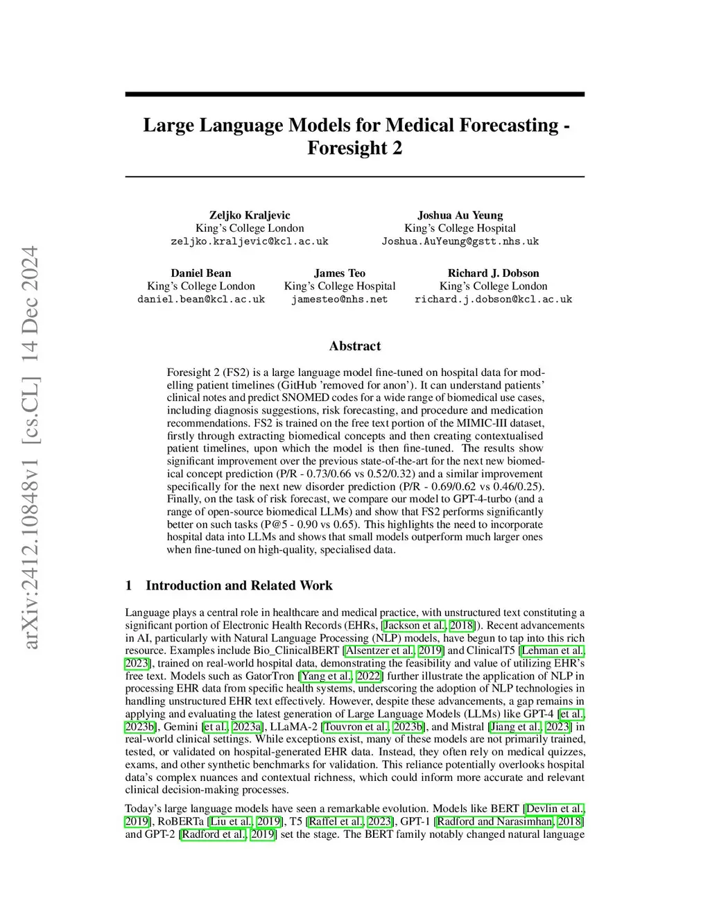 Foresight 2 (FS2) is a large language model fine-tuned on hospital data for modelling patient timelines (GitHub 'removed for anon'). It can understand patients' clinical notes and predict SNOMED codes for a wide range of biomedical use cases, including diagnosis suggestions, risk forecasting, and procedure and medication recommendations. FS2 is trained on the free text portion of the MIMIC-III dataset, firstly through extracting biomedical concepts and then creating contextualised patient timelines, upon which the model is then fine-tuned. The results show significant improvement over the previous state-of-the-art for the next new biomedical concept prediction (P/R - 0.73/0.66 vs 0.52/0.32) and a similar improvement specifically for the next new disorder prediction (P/R - 0.69/0.62 vs 0.46/0.25). Finally, on the task of risk forecast, we compare our model to GPT-4-turbo (and a range of open-source biomedical LLMs) and show that FS2 performs significantly better on such tasks (P@5 - 0.90 vs 0.65). This highlights the need to incorporate hospital data into LLMs and shows that small models outperform much larger ones when fine-tuned on high-quality, specialised data.