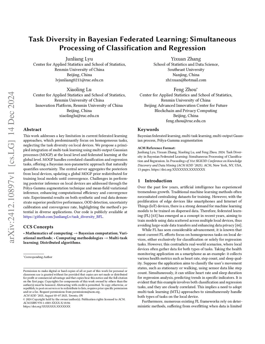 This work addresses a key limitation in current federated learning approaches, which predominantly focus on homogeneous tasks, neglecting the task diversity on local devices. We propose a principled integration of multi-task learning using multi-output Gaussian processes (MOGP) at the local level and federated learning at the global level. MOGP handles correlated classification and regression tasks, offering a Bayesian non-parametric approach that naturally quantifies uncertainty. The central server aggregates the posteriors from local devices, updating a global MOGP prior redistributed for training local models until convergence. Challenges in performing posterior inference on local devices are addressed through the P\'{o}lya-Gamma augmentation technique and mean-field variational inference, enhancing computational efficiency and convergence rate. Experimental results on both synthetic and real data demonstrate superior predictive performance, OOD detection, uncertainty calibration and convergence rate, highlighting the method's potential in diverse applications. Our code is publicly available at https://github.com/JunliangLv/task_diversity_BFL.