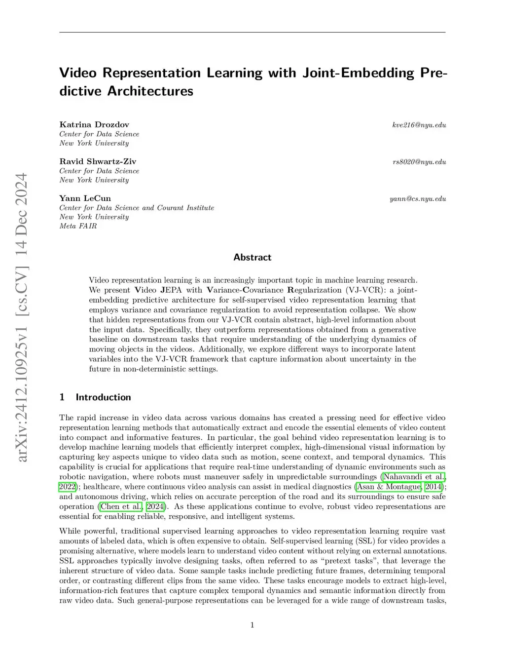 Video representation learning is an increasingly important topic in machine learning research. We present Video JEPA with Variance-Covariance Regularization (VJ-VCR): a joint-embedding predictive architecture for self-supervised video representation learning that employs variance and covariance regularization to avoid representation collapse. We show that hidden representations from our VJ-VCR contain abstract, high-level information about the input data. Specifically, they outperform representations obtained from a generative baseline on downstream tasks that require understanding of the underlying dynamics of moving objects in the videos. Additionally, we explore different ways to incorporate latent variables into the VJ-VCR framework that capture information about uncertainty in the future in non-deterministic settings.