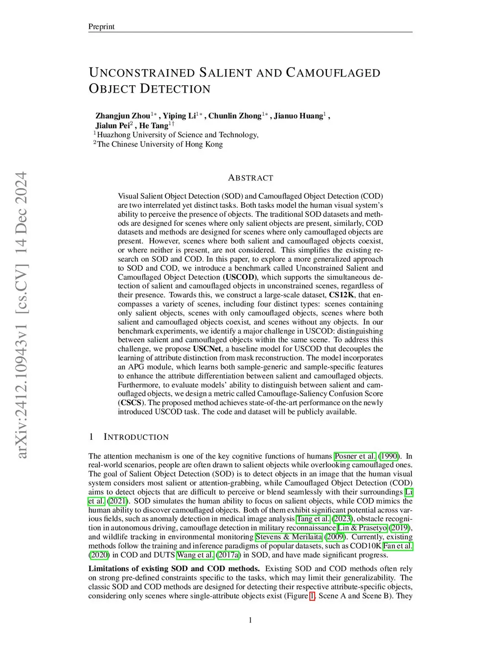 While the human visual system employs distinct mechanisms to perceive salient and camouflaged objects, existing models struggle to disentangle these tasks. Specifically, salient object detection (SOD) models frequently misclassify camouflaged objects as salient, while camouflaged object detection (COD) models conversely misinterpret salient objects as camouflaged. We hypothesize that this can be attributed to two factors: (i) the specific annotation paradigm of current SOD and COD datasets, and (ii) the lack of explicit attribute relationship modeling in current models. Prevalent SOD/COD datasets enforce a mutual exclusivity constraint, assuming scenes contain either salient or camouflaged objects, which poorly aligns with the real world. Furthermore, current SOD/COD methods are primarily designed for these highly constrained datasets and lack explicit modeling of the relationship between salient and camouflaged objects. In this paper, to promote the development of unconstrained salient and camouflaged object detection, we construct a large-scale dataset, USC12K, which features comprehensive labels and four different scenes that cover all possible logical existence scenarios of both salient and camouflaged objects. To explicitly model the relationship between salient and camouflaged objects, we propose a model called USCNet, which introduces two distinct prompt query mechanisms for modeling inter-sample and intra-sample attribute relationships. Additionally, to assess the model's ability to distinguish between salient and camouflaged objects, we design an evaluation metric called CSCS. The proposed method achieves state-of-the-art performance across all scenes in various metrics. The code and dataset will be available at this https URL.