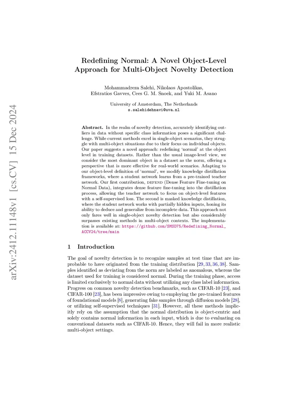 In the realm of novelty detection, accurately identifying outliers in data without specific class information poses a significant challenge. While current methods excel in single-object scenarios, they struggle with multi-object situations due to their focus on individual objects. Our paper suggests a novel approach: redefining `normal' at the object level in training datasets. Rather than the usual image-level view, we consider the most dominant object in a dataset as the norm, offering a perspective that is more effective for real-world scenarios. Adapting to our object-level definition of `normal', we modify knowledge distillation frameworks, where a student network learns from a pre-trained teacher network. Our first contribution, DeFeND(Dense Feature Fine-tuning on Normal Data), integrates dense feature fine-tuning into the distillation process, allowing the teacher network to focus on object-level features with a self-supervised loss. The second is masked knowledge distillation, where the student network works with partially hidden inputs, honing its ability to deduce and generalize from incomplete data. This approach not only fares well in single-object novelty detection but also considerably surpasses existing methods in multi-object contexts. The implementation is available at: https://github.com/SMSD75/Redefining_Normal_ACCV24/tree/main