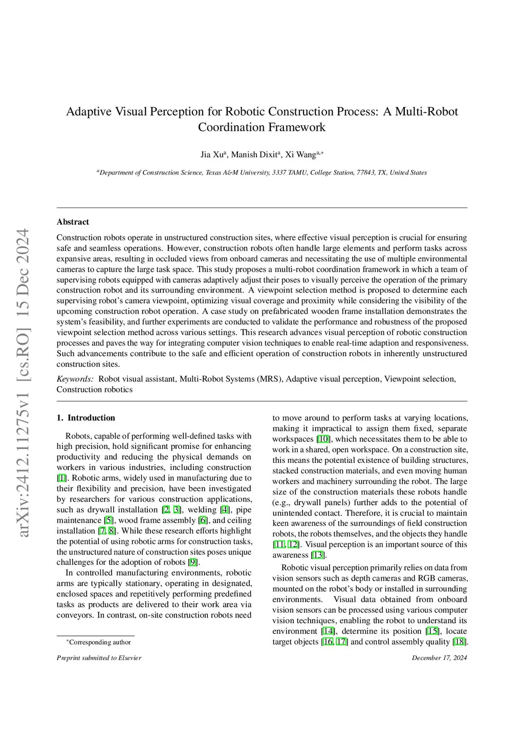 Construction robots operate in unstructured construction sites, where effective visual perception is crucial for ensuring safe and seamless operations. However, construction robots often handle large elements and perform tasks across expansive areas, resulting in occluded views from onboard cameras and necessitating the use of multiple environmental cameras to capture the large task space. This study proposes a multi-robot coordination framework in which a team of supervising robots equipped with cameras adaptively adjust their poses to visually perceive the operation of the primary construction robot and its surrounding environment. A viewpoint selection method is proposed to determine each supervising robot's camera viewpoint, optimizing visual coverage and proximity while considering the visibility of the upcoming construction robot operation. A case study on prefabricated wooden frame installation demonstrates the system's feasibility, and further experiments are conducted to validate the performance and robustness of the proposed viewpoint selection method across various settings. This research advances visual perception of robotic construction processes and paves the way for integrating computer vision techniques to enable real-time adaption and responsiveness. Such advancements contribute to the safe and efficient operation of construction robots in inherently unstructured construction sites.