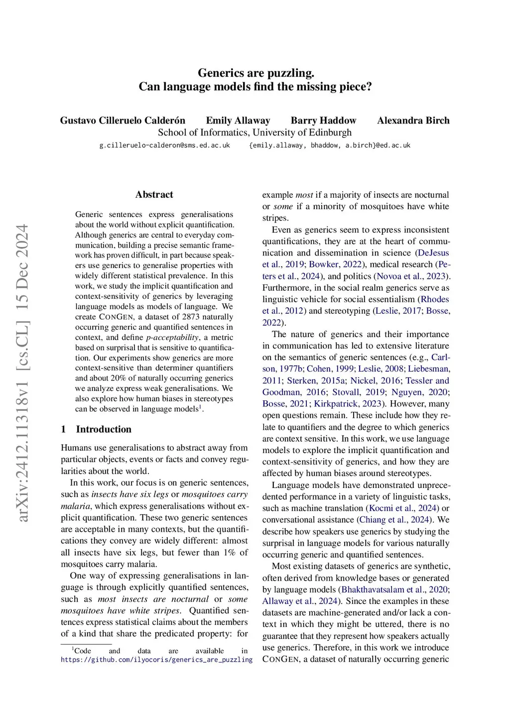 Generic sentences express generalisations about the world without explicit quantification. Although generics are central to everyday communication, building a precise semantic framework has proven difficult, in part because speakers use generics to generalise properties with widely different statistical prevalence. In this work, we study the implicit quantification and context-sensitivity of generics by leveraging language models as models of language. We create ConGen, a dataset of 2873 naturally occurring generic and quantified sentences in context, and define p-acceptability, a metric based on surprisal that is sensitive to quantification. Our experiments show generics are more context-sensitive than determiner quantifiers and about 20% of naturally occurring generics we analyze express weak generalisations. We also explore how human biases in stereotypes can be observed in language models.