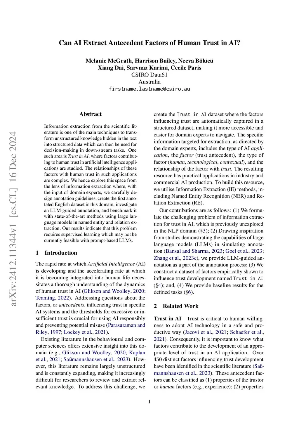 Information extraction from the scientific literature is one of the main techniques to transform unstructured knowledge hidden in the text into structured data which can then be used for decision-making in down-stream tasks. One such area is Trust in AI, where factors contributing to human trust in artificial intelligence applications are studied. The relationships of these factors with human trust in such applications are complex. We hence explore this space from the lens of information extraction where, with the input of domain experts, we carefully design annotation guidelines, create the first annotated English dataset in this domain, investigate an LLM-guided annotation, and benchmark it with state-of-the-art methods using large language models in named entity and relation extraction. Our results indicate that this problem requires supervised learning which may not be currently feasible with prompt-based LLMs.