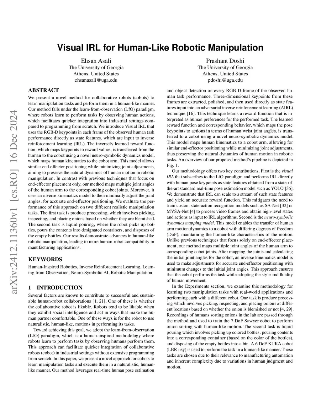 We present a novel method for collaborative robots (cobots) to learn manipulation tasks and perform them in a human-like manner. Our method falls under the learn-from-observation (LfO) paradigm, where robots learn to perform tasks by observing human actions, which facilitates quicker integration into industrial settings compared to programming from scratch. We introduce Visual IRL that uses the RGB-D keypoints in each frame of the observed human task performance directly as state features, which are input to inverse reinforcement learning (IRL). The inversely learned reward function, which maps keypoints to reward values, is transferred from the human to the cobot using a novel neuro-symbolic dynamics model, which maps human kinematics to the cobot arm. This model allows similar end-effector positioning while minimizing joint adjustments, aiming to preserve the natural dynamics of human motion in robotic manipulation. In contrast with previous techniques that focus on end-effector placement only, our method maps multiple joint angles of the human arm to the corresponding cobot joints. Moreover, it uses an inverse kinematics model to then minimally adjust the joint angles, for accurate end-effector positioning. We evaluate the performance of this approach on two different realistic manipulation tasks. The first task is produce processing, which involves picking, inspecting, and placing onions based on whether they are blemished. The second task is liquid pouring, where the robot picks up bottles, pours the contents into designated containers, and disposes of the empty bottles. Our results demonstrate advances in human-like robotic manipulation, leading to more human-robot compatibility in manufacturing applications.