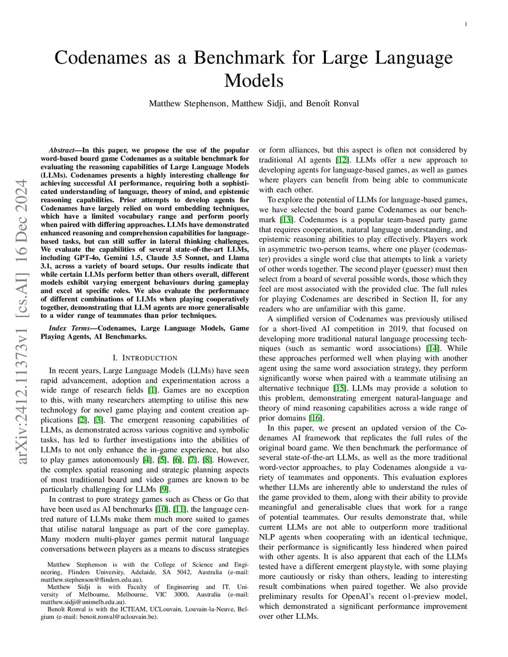 In this paper, we propose the use of the popular word-based board game Codenames as a suitable benchmark for evaluating the reasoning capabilities of Large Language Models (LLMs). Codenames presents a highly interesting challenge for achieving successful AI performance, requiring both a sophisticated understanding of language, theory of mind, and epistemic reasoning capabilities. Prior attempts to develop agents for Codenames have largely relied on word embedding techniques, which have a limited vocabulary range and perform poorly when paired with differing approaches. LLMs have demonstrated enhanced reasoning and comprehension capabilities for language-based tasks, but can still suffer in lateral thinking challenges. We evaluate the capabilities of several state-of-the-art LLMs, including GPT-4o, Gemini 1.5, Claude 3.5 Sonnet, and Llama 3.1, across a variety of board setups. Our results indicate that while certain LLMs perform better than others overall, different models exhibit varying emergent behaviours during gameplay and excel at specific roles. We also evaluate the performance of different combinations of LLMs when playing cooperatively together, demonstrating that LLM agents are more generalisable to a wider range of teammates than prior techniques.