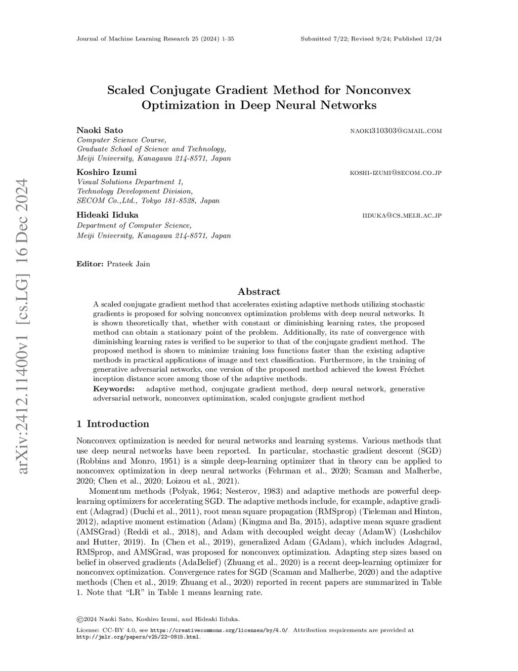 A scaled conjugate gradient method that accelerates existing adaptive methods utilizing stochastic gradients is proposed for solving nonconvex optimization problems with deep neural networks. It is shown theoretically that, whether with constant or diminishing learning rates, the proposed method can obtain a stationary point of the problem. Additionally, its rate of convergence with diminishing learning rates is verified to be superior to that of the conjugate gradient method. The proposed method is shown to minimize training loss functions faster than the existing adaptive methods in practical applications of image and text classification. Furthermore, in the training of generative adversarial networks, one version of the proposed method achieved the lowest Frechet inception distance score among those of the adaptive methods.