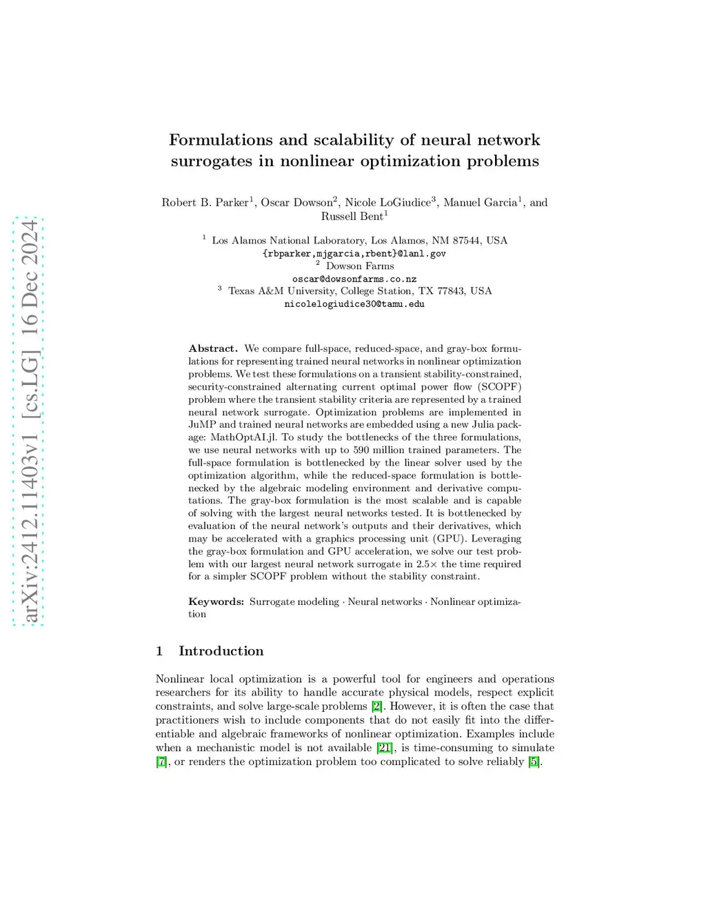 We compare full-space, reduced-space, and gray-box formulations for representing trained neural networks in nonlinear constrained optimization problems. We test these formulations on a transient stability-constrained, security-constrained alternating current optimal power flow (SCOPF) problem where the transient stability criteria are represented by a trained neural network surrogate. Optimization problems are implemented in JuMP and trained neural networks are embedded using a new Julia package: MathOptAI.jl. To study the bottlenecks of the three formulations, we use neural networks with up to 590 million trained parameters. The full-space formulation is bottlenecked by the linear solver used by the optimization algorithm, while the reduced-space formulation is bottlenecked by the algebraic modeling environment and derivative computations. The gray-box formulation is the most scalable and is capable of solving with the largest neural networks tested. It is bottlenecked by evaluation of the neural network's outputs and their derivatives, which may be accelerated with a graphics processing unit (GPU). Leveraging the gray-box formulation and GPU acceleration, we solve our test problem with our largest neural network surrogate in 2.5 the time required for a simpler SCOPF problem without the stability constraint.