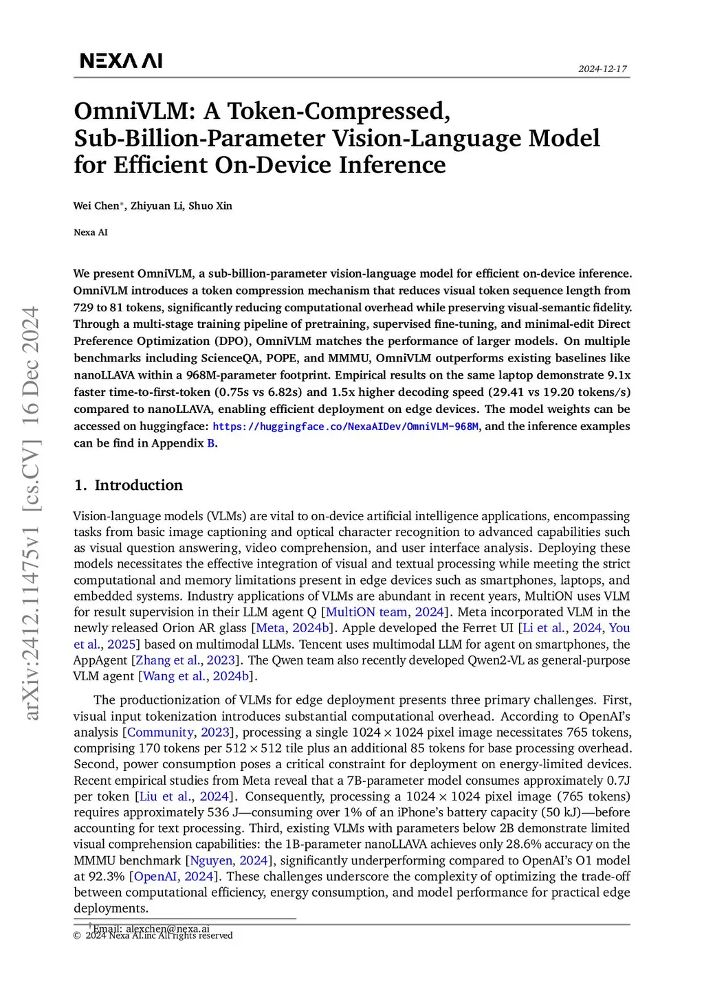 We present OmniVLM, a sub-billion-parameter vision-language model for efficient on-device inference. OmniVLM introduces a token compression mechanism that reduces visual token sequence length from 729 to 81 tokens, significantly reducing computational overhead while preserving visual-semantic fidelity. Through a multi-stage training pipeline of pretraining, supervised fine-tuning, and minimal-edit Direct Preference Optimization (DPO), OmniVLM matches the performance of larger models. On multiple benchmarks including ScienceQA, POPE, and MMMU, OmniVLM outperforms existing baselines like nanoLLAVA within a 968M-parameter footprint. Empirical results on the same laptop demonstrate 9.1x faster time-to-first-token (0.75s vs 6.82s) and 1.5x higher decoding speed (29.41 vs 19.20 tokens/s) compared to nanoLLAVA, enabling efficient deployment on edge devices. The model weights can be accessed on huggingface: \url{https://huggingface.co/NexaAIDev/OmniVLM-968M}, and the inference examples can be find in Appendix B.