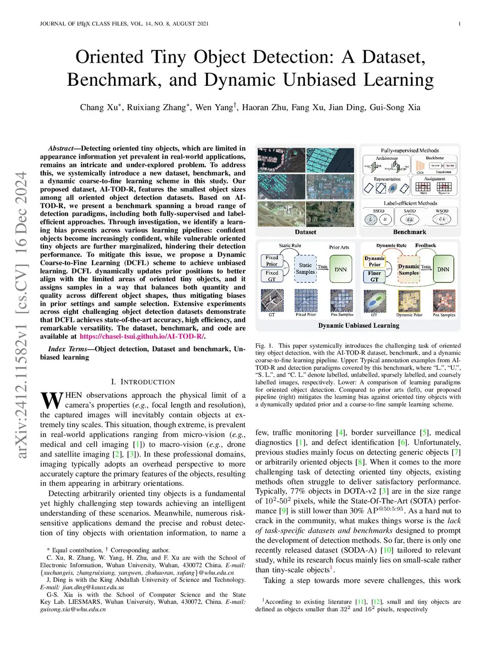 Detecting oriented tiny objects, which are limited in appearance information yet prevalent in real-world applications, remains an intricate and under-explored problem. To address this, we systemically introduce a new dataset, benchmark, and a dynamic coarse-to-fine learning scheme in this study. Our proposed dataset, AI-TOD-R, features the smallest object sizes among all oriented object detection datasets. Based on AI-TOD-R, we present a benchmark spanning a broad range of detection paradigms, including both fully-supervised and label-efficient approaches. Through investigation, we identify a learning bias presents across various learning pipelines: confident objects become increasingly confident, while vulnerable oriented tiny objects are further marginalized, hindering their detection performance. To mitigate this issue, we propose a Dynamic Coarse-to-Fine Learning (DCFL) scheme to achieve unbiased learning. DCFL dynamically updates prior positions to better align with the limited areas of oriented tiny objects, and it assigns samples in a way that balances both quantity and quality across different object shapes, thus mitigating biases in prior settings and sample selection. Extensive experiments across eight challenging object detection datasets demonstrate that DCFL achieves state-of-the-art accuracy, high efficiency, and remarkable versatility. The dataset, benchmark, and code are available at https://chasel-tsui.github.io/AI-TOD-R/.