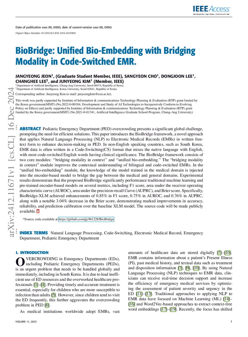 Pediatric Emergency Department (PED) overcrowding presents a significant global challenge, prompting the need for efficient solutions. This paper introduces the BioBridge framework, a novel approach that applies Natural Language Processing (NLP) to Electronic Medical Records (EMRs) in written free-text form to enhance decision-making in PED. In non-English speaking countries, such as South Korea, EMR data is often written in a Code-Switching (CS) format that mixes the native language with English, with most code-switched English words having clinical significance. The BioBridge framework consists of two core modules: "bridging modality in context" and "unified bio-embedding." The "bridging modality in context" module improves the contextual understanding of bilingual and code-switched EMRs. In the "unified bio-embedding" module, the knowledge of the model trained in the medical domain is injected into the encoder-based model to bridge the gap between the medical and general domains. Experimental results demonstrate that the proposed BioBridge significantly performance traditional machine learning and pre-trained encoder-based models on several metrics, including F1 score, area under the receiver operating characteristic curve (AUROC), area under the precision-recall curve (AUPRC), and Brier score. Specifically, BioBridge-XLM achieved enhancements of 0.85% in F1 score, 0.75% in AUROC, and 0.76% in AUPRC, along with a notable 3.04% decrease in the Brier score, demonstrating marked improvements in accuracy, reliability, and prediction calibration over the baseline XLM model. The source code will be made publicly available.