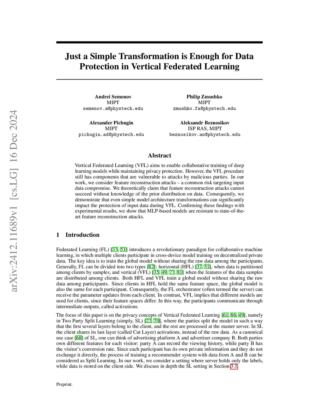 Vertical Federated Learning (VFL) aims to enable collaborative training of deep learning models while maintaining privacy protection. However, the VFL procedure still has components that are vulnerable to attacks by malicious parties. In our work, we consider feature reconstruction attacks, a common risk targeting input data compromise. We theoretically claim that feature reconstruction attacks cannot succeed without knowledge of the prior distribution on data. Consequently, we demonstrate that even simple model architecture transformations can significantly impact the protection of input data during VFL. Confirming these findings with experimental results, we show that MLP-based models are resistant to state-of-the-art feature reconstruction attacks.