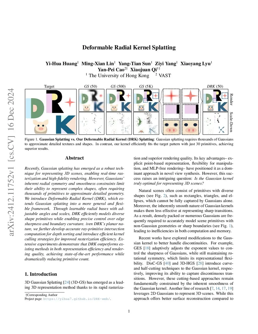 Recently, Gaussian splatting has emerged as a robust technique for representing 3D scenes, enabling real-time rasterization and high-fidelity rendering. However, Gaussians' inherent radial symmetry and smoothness constraints limit their ability to represent complex shapes, often requiring thousands of primitives to approximate detailed geometry. We introduce Deformable Radial Kernel (DRK), which extends Gaussian splatting into a more general and flexible framework. Through learnable radial bases with adjustable angles and scales, DRK efficiently models diverse shape primitives while enabling precise control over edge sharpness and boundary curvature. iven DRK's planar nature, we further develop accurate ray-primitive intersection computation for depth sorting and introduce efficient kernel culling strategies for improved rasterization efficiency. Extensive experiments demonstrate that DRK outperforms existing methods in both representation efficiency and rendering quality, achieving state-of-the-art performance while dramatically reducing primitive count.
