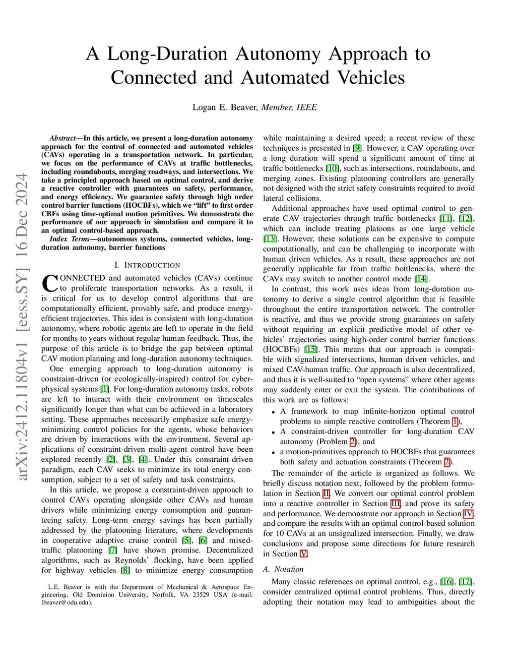 In this article, we present a long-duration autonomy approach for the control of connected and automated vehicles (CAVs) operating in a transportation network. In particular, we focus on the performance of CAVs at traffic bottlenecks, including roundabouts, merging roadways, and intersections. We take a principled approach based on optimal control, and derive a reactive controller with guarantees on safety, performance, and energy efficiency. We guarantee safety through high order control barrier functions (HOCBFs), which we ``lift'' to first order CBFs using time-optimal motion primitives. This yields a set of first-order CBFs that are compatible with the control bounds. We demonstrate the performance of our approach in simulation and compare it to an optimal control-based approach.