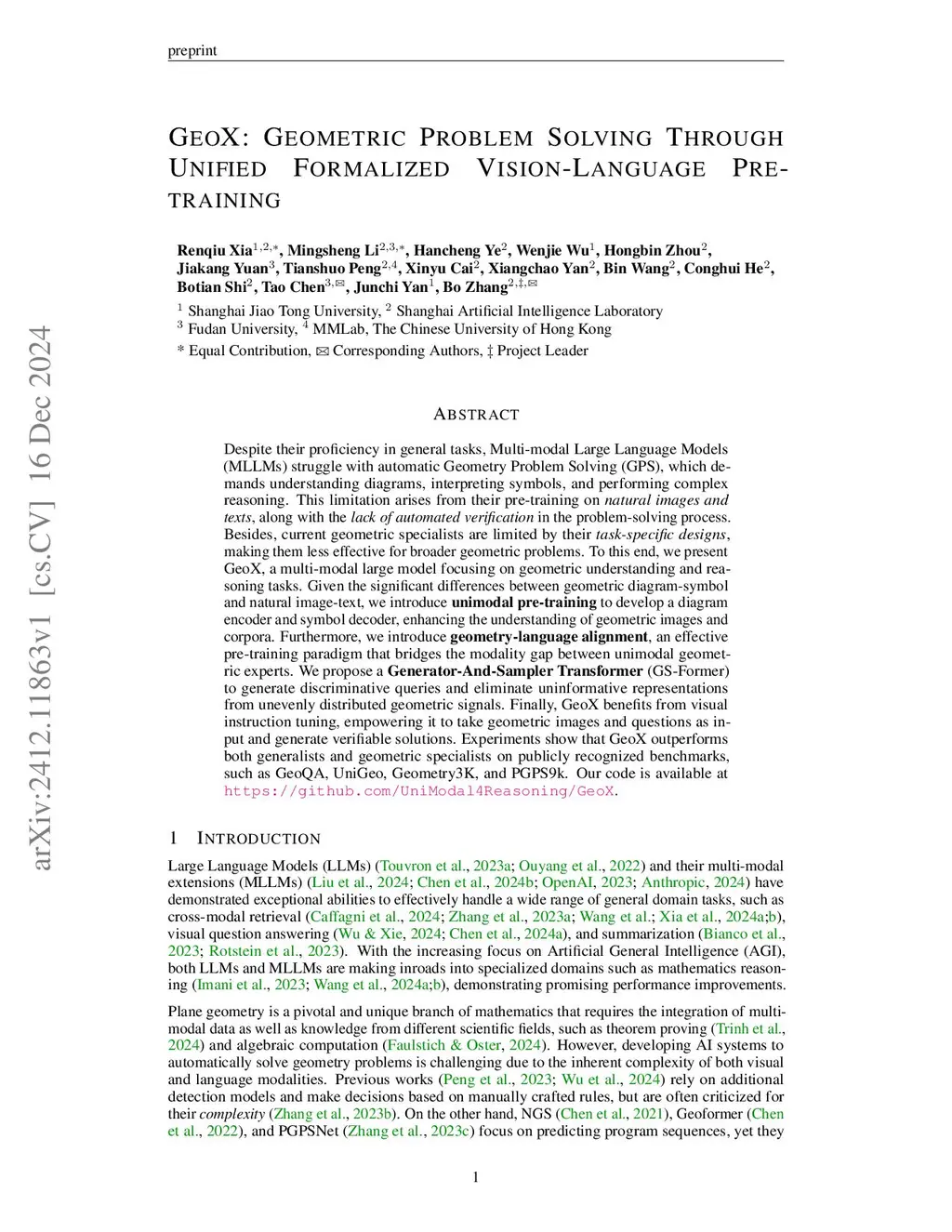 Despite their proficiency in general tasks, Multi-modal Large Language Models (MLLMs) struggle with automatic Geometry Problem Solving (GPS), which demands understanding diagrams, interpreting symbols, and performing complex reasoning. This limitation arises from their pre-training on natural images and texts, along with the lack of automated verification in the problem-solving process. Besides, current geometric specialists are limited by their task-specific designs, making them less effective for broader geometric problems. To this end, we present GeoX, a multi-modal large model focusing on geometric understanding and reasoning tasks. Given the significant differences between geometric diagram-symbol and natural image-text, we introduce unimodal pre-training to develop a diagram encoder and symbol decoder, enhancing the understanding of geometric images and corpora. Furthermore, we introduce geometry-language alignment, an effective pre-training paradigm that bridges the modality gap between unimodal geometric experts. We propose a Generator-And-Sampler Transformer (GS-Former) to generate discriminative queries and eliminate uninformative representations from unevenly distributed geometric signals. Finally, GeoX benefits from visual instruction tuning, empowering it to take geometric images and questions as input and generate verifiable solutions. Experiments show that GeoX outperforms both generalists and geometric specialists on publicly recognized benchmarks, such as GeoQA, UniGeo, Geometry3K, and PGPS9k.