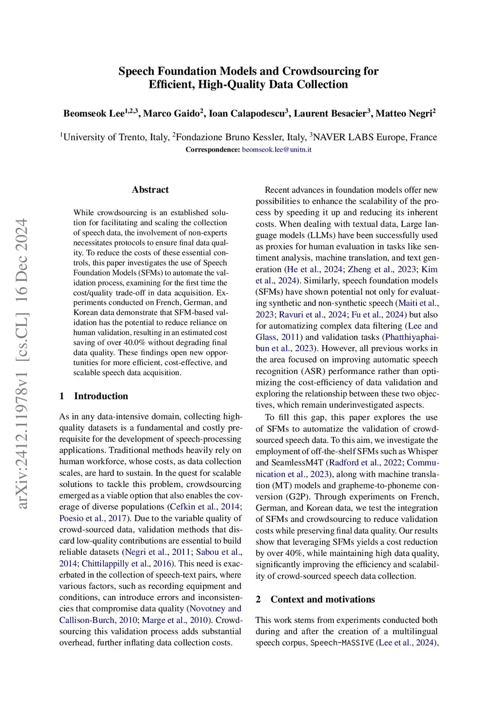 Speech Foundation Models and Crowdsourcing for Efficient, High-Quality