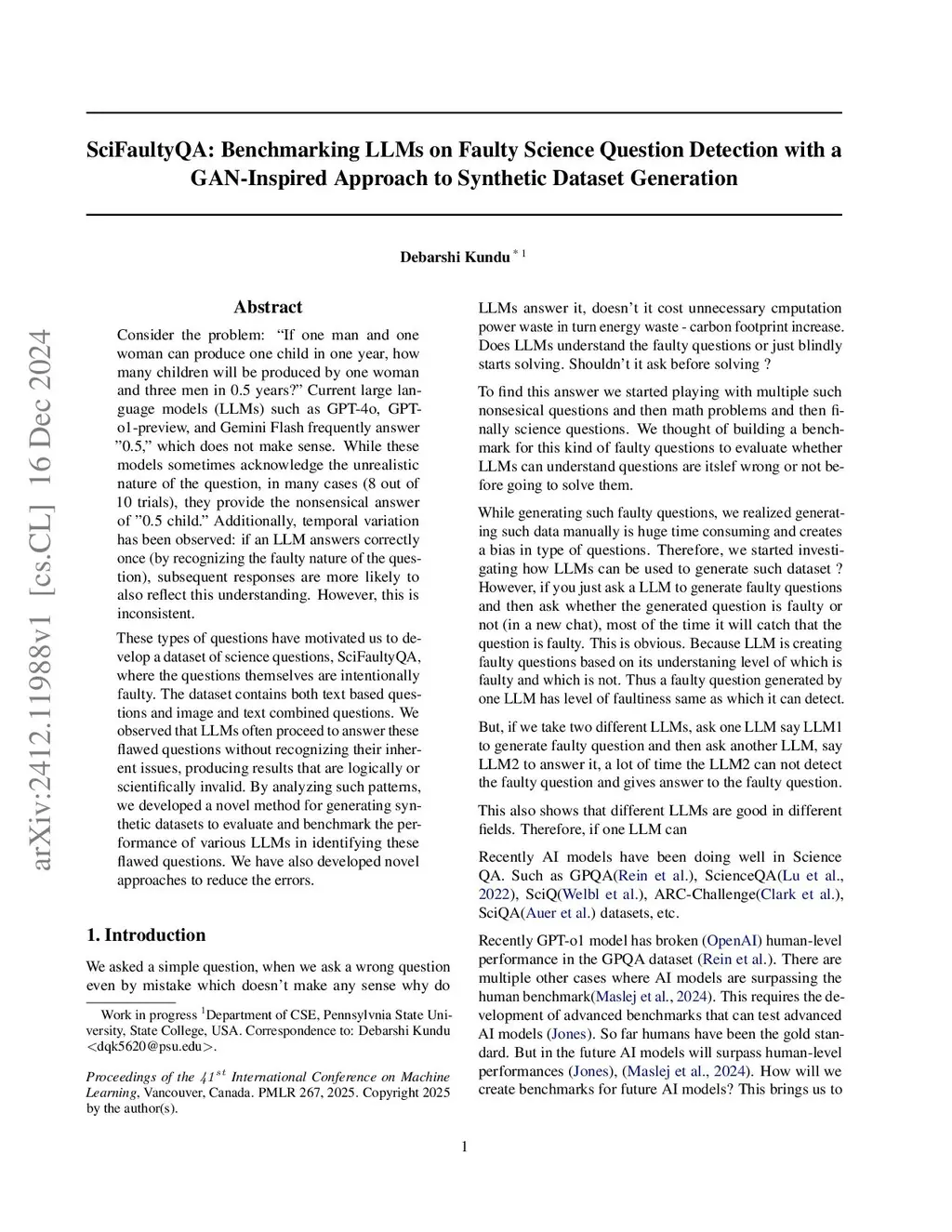 Consider the problem: ``If one man and one woman can produce one child in one year, how many children will be produced by one woman and three men in 0.5 years?" Current large language models (LLMs) such as GPT-4o, GPT-o1-preview, and Gemini Flash frequently answer "0.5," which does not make sense. While these models sometimes acknowledge the unrealistic nature of the question, in many cases (8 out of 10 trials), they provide the nonsensical answer of "0.5 child." Additionally, temporal variation has been observed: if an LLM answers correctly once (by recognizing the faulty nature of the question), subsequent responses are more likely to also reflect this understanding. However, this is inconsistent. These types of questions have motivated us to develop a dataset of science questions, SciFaultyQA, where the questions themselves are intentionally faulty. We observed that LLMs often proceed to answer these flawed questions without recognizing their inherent issues, producing results that are logically or scientifically invalid. By analyzing such patterns, we developed a novel method for generating synthetic datasets to evaluate and benchmark the performance of various LLMs in identifying these flawed questions. We have also developed novel approaches to reduce the errors.