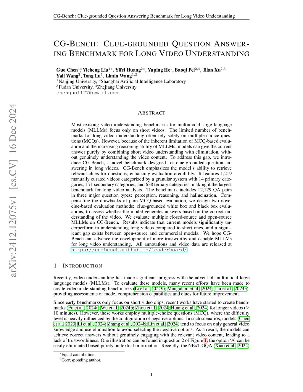 Most existing video understanding benchmarks for multimodal large language models (MLLMs) focus only on short videos. The limited number of benchmarks for long video understanding often rely solely on multiple-choice questions (MCQs). However, because of the inherent limitation of MCQ-based evaluation and the increasing reasoning ability of MLLMs, models can give the current answer purely by combining short video understanding with elimination, without genuinely understanding the video content. To address this gap, we introduce CG-Bench, a novel benchmark designed for clue-grounded question answering in long videos. CG-Bench emphasizes the model's ability to retrieve relevant clues for questions, enhancing evaluation credibility. It features 1,219 manually curated videos categorized by a granular system with 14 primary categories, 171 secondary categories, and 638 tertiary categories, making it the largest benchmark for long video analysis. The benchmark includes 12,129 QA pairs in three major question types: perception, reasoning, and hallucination. Compensating the drawbacks of pure MCQ-based evaluation, we design two novel clue-based evaluation methods: clue-grounded white box and black box evaluations, to assess whether the model generates answers based on the correct understanding of the video. We evaluate multiple closed-source and open-source MLLMs on CG-Bench. Results indicate that current models significantly underperform in understanding long videos compared to short ones, and a significant gap exists between open-source and commercial models. We hope CG-Bench can advance the development of more trustworthy and capable MLLMs for long video understanding. All annotations and video data are released at https://cg-bench.github.io/leaderboard/.