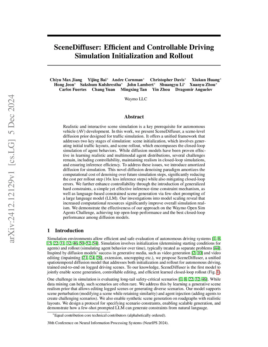 Realistic and interactive scene simulation is a key prerequisite for autonomous vehicle (AV) development. In this work, we present SceneDiffuser, a scene-level diffusion prior designed for traffic simulation. It offers a unified framework that addresses two key stages of simulation: scene initialization, which involves generating initial traffic layouts, and scene rollout, which encompasses the closed-loop simulation of agent behaviors. While diffusion models have been proven effective in learning realistic and multimodal agent distributions, several challenges remain, including controllability, maintaining realism in closed-loop simulations, and ensuring inference efficiency. To address these issues, we introduce amortized diffusion for simulation. This novel diffusion denoising paradigm amortizes the computational cost of denoising over future simulation steps, significantly reducing the cost per rollout step (16x less inference steps) while also mitigating closed-loop errors. We further enhance controllability through the introduction of generalized hard constraints, a simple yet effective inference-time constraint mechanism, as well as language-based constrained scene generation via few-shot prompting of a large language model (LLM). Our investigations into model scaling reveal that increased computational resources significantly improve overall simulation realism. We demonstrate the effectiveness of our approach on the Waymo Open Sim Agents Challenge, achieving top open-loop performance and the best closed-loop performance among diffusion models.