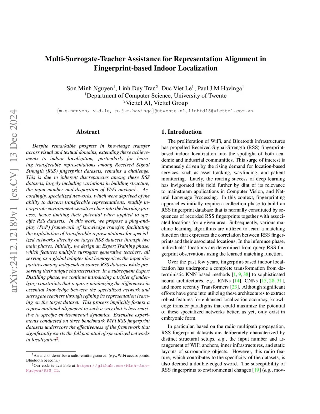 Despite remarkable progress in knowledge transfer across visual and textual domains, extending these achievements to indoor localization, particularly for learning transferable representations among Received Signal Strength (RSS) fingerprint datasets, remains a challenge. This is due to inherent discrepancies among these RSS datasets, largely including variations in building structure, the input number and disposition of WiFi anchors. Accordingly, specialized networks, which were deprived of the ability to discern transferable representations, readily incorporate environment-sensitive clues into the learning process, hence limiting their potential when applied to specific RSS datasets. In this work, we propose a plug-and-play (PnP) framework of knowledge transfer, facilitating the exploitation of transferable representations for specialized networks directly on target RSS datasets through two main phases. Initially, we design an Expert Training phase, which features multiple surrogate generative teachers, all serving as a global adapter that homogenizes the input disparities among independent source RSS datasets while preserving their unique characteristics. In a subsequent Expert Distilling phase, we continue introducing a triplet of underlying constraints that requires minimizing the differences in essential knowledge between the specialized network and surrogate teachers through refining its representation learning on the target dataset. This process implicitly fosters a representational alignment in such a way that is less sensitive to specific environmental dynamics. Extensive experiments conducted on three benchmark WiFi RSS fingerprint datasets underscore the effectiveness of the framework that significantly exerts the full potential of specialized networks in localization.