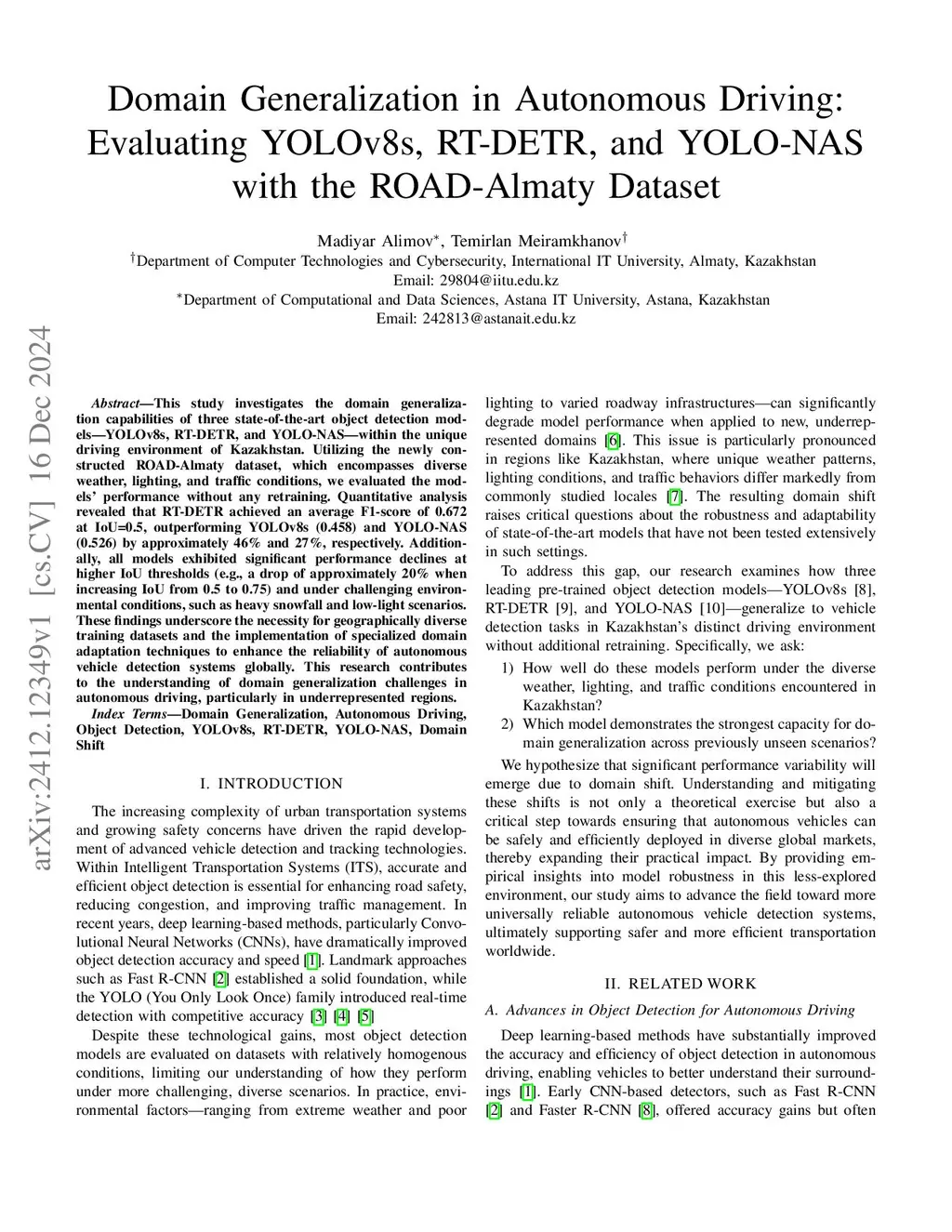 RT-DETR, and YOLO-NAS with the ROAD-Almaty Dataset