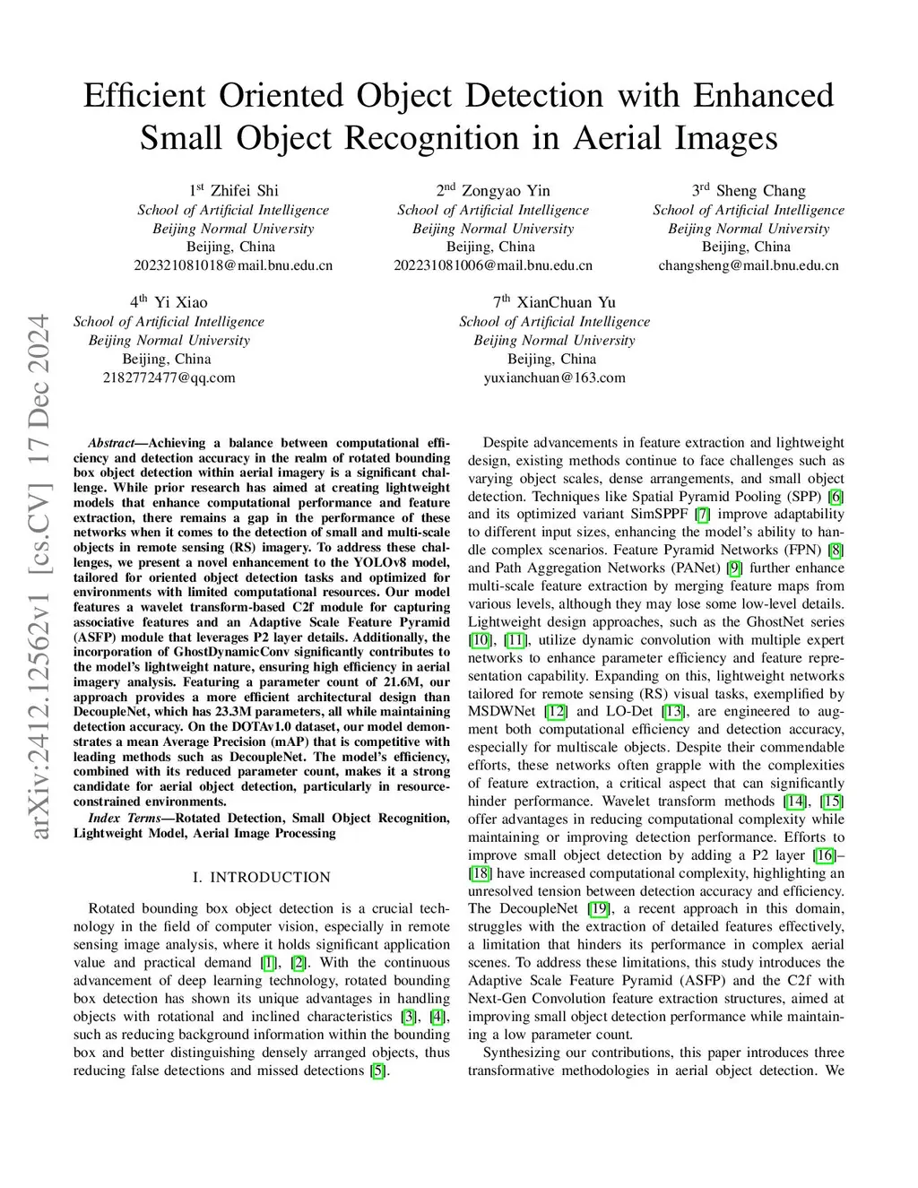 Achieving a balance between computational efficiency and detection accuracy in the realm of rotated bounding box object detection within aerial imagery is a significant challenge. While prior research has aimed at creating lightweight models that enhance computational performance and feature extraction, there remains a gap in the performance of these networks when it comes to the detection of small and multi-scale objects in remote sensing (RS) imagery. To address these challenges, we present a novel enhancement to the YOLOv8 model, tailored for oriented object detection tasks and optimized for environments with limited computational resources. Our model features a wavelet transform-based C2f module for capturing associative features and an Adaptive Scale Feature Pyramid (ASFP) module that leverages P2 layer details. Additionally, the incorporation of GhostDynamicConv significantly contributes to the model's lightweight nature, ensuring high efficiency in aerial imagery analysis. Featuring a parameter count of 21.6M, our approach provides a more efficient architectural design than DecoupleNet, which has 23.3M parameters, all while maintaining detection accuracy. On the DOTAv1.0 dataset, our model demonstrates a mean Average Precision (mAP) that is competitive with leading methods such as DecoupleNet. The model's efficiency, combined with its reduced parameter count, makes it a strong candidate for aerial object detection, particularly in resource-constrained environments.