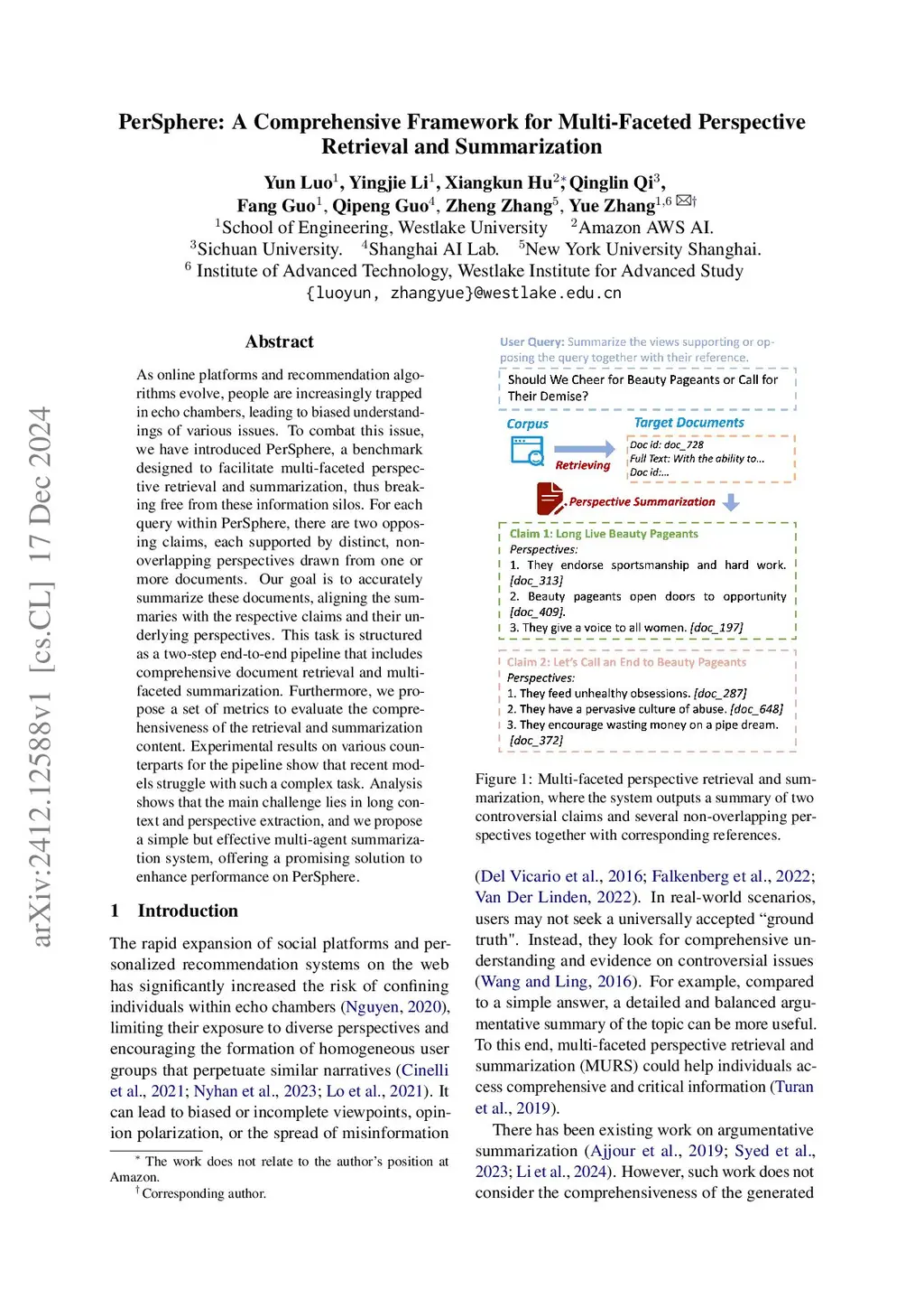 As online platforms and recommendation algorithms evolve, people are increasingly trapped in echo chambers, leading to biased understandings of various issues. To combat this issue, we have introduced PerSphere, a benchmark designed to facilitate multi-faceted perspective retrieval and summarization, thus breaking free from these information silos. For each query within PerSphere, there are two opposing claims, each supported by distinct, non-overlapping perspectives drawn from one or more documents. Our goal is to accurately summarize these documents, aligning the summaries with the respective claims and their underlying perspectives. This task is structured as a two-step end-to-end pipeline that includes comprehensive document retrieval and multi-faceted summarization. Furthermore, we propose a set of metrics to evaluate the comprehensiveness of the retrieval and summarization content. Experimental results on various counterparts for the pipeline show that recent models struggle with such a complex task. Analysis shows that the main challenge lies in long context and perspective extraction, and we propose a simple but effective multi-agent summarization system, offering a promising solution to enhance performance on PerSphere.