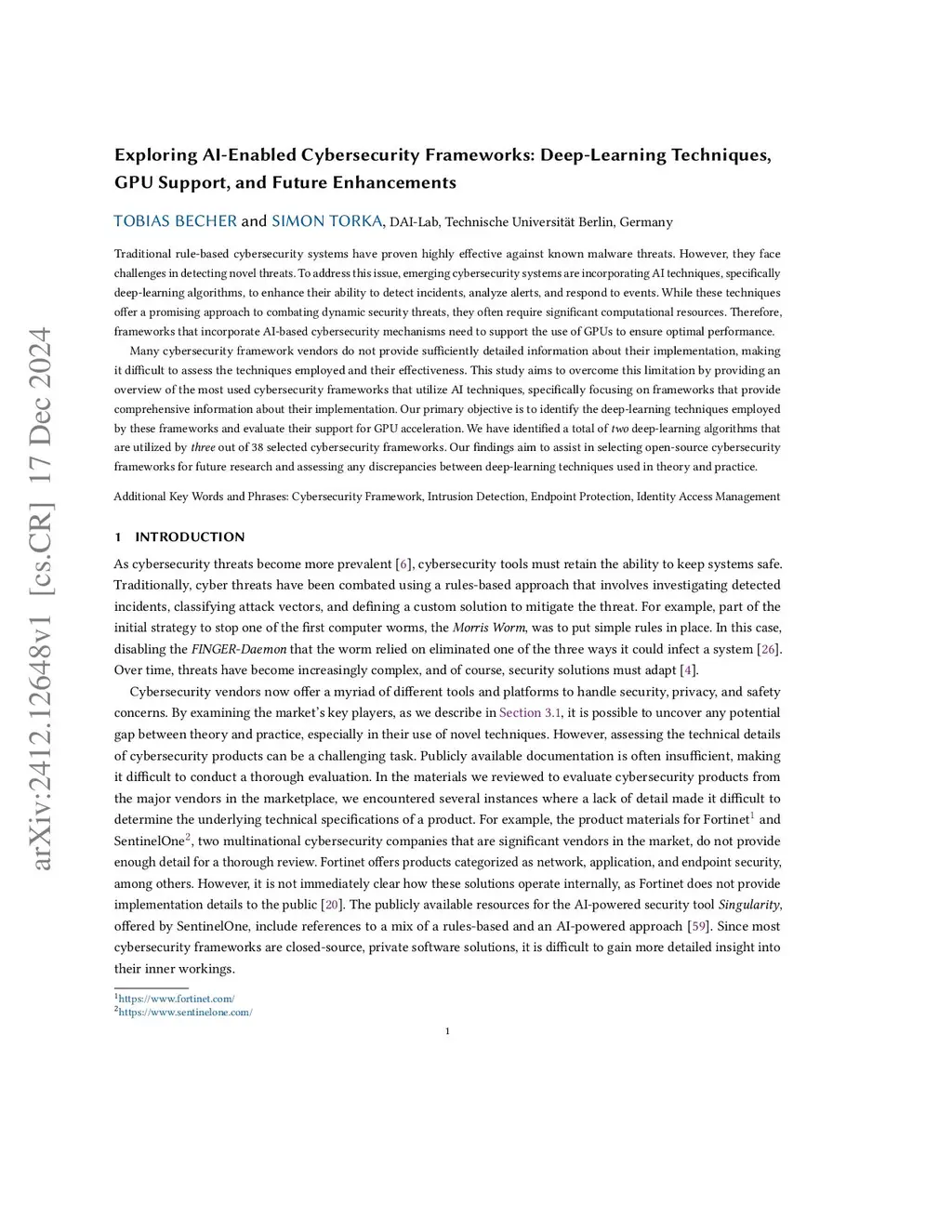 Traditional rule-based cybersecurity systems have proven highly effective against known malware threats. However, they face challenges in detecting novel threats. To address this issue, emerging cybersecurity systems are incorporating AI techniques, specifically deep-learning algorithms, to enhance their ability to detect incidents, analyze alerts, and respond to events. While these techniques offer a promising approach to combating dynamic security threats, they often require significant computational resources. Therefore, frameworks that incorporate AI-based cybersecurity mechanisms need to support the use of GPUs to ensure optimal performance. Many cybersecurity framework vendors do not provide sufficiently detailed information about their implementation, making it difficult to assess the techniques employed and their effectiveness. This study aims to overcome this limitation by providing an overview of the most used cybersecurity frameworks that utilize AI techniques, specifically focusing on frameworks that provide comprehensive information about their implementation. Our primary objective is to identify the deep-learning techniques employed by these frameworks and evaluate their support for GPU acceleration. We have identified a total of \emph{two} deep-learning algorithms that are utilized by \emph{three} out of 38 selected cybersecurity frameworks. Our findings aim to assist in selecting open-source cybersecurity frameworks for future research and assessing any discrepancies between deep-learning techniques used in theory and practice.