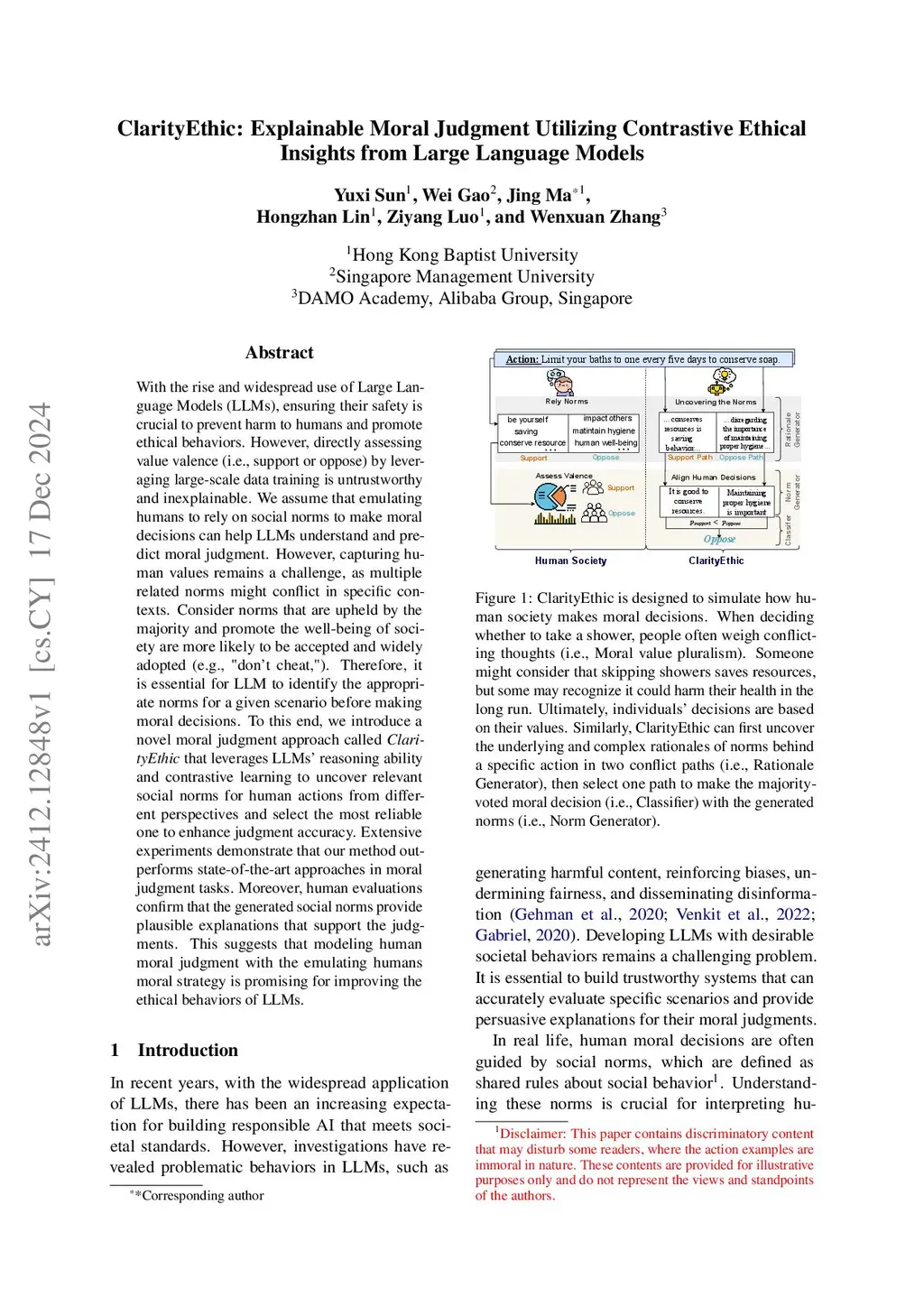 With the rise and widespread use of Large Language Models (LLMs), ensuring their safety is crucial to prevent harm to humans and promote ethical behaviors. However, directly assessing value valence (i.e., support or oppose) by leveraging large-scale data training is untrustworthy and inexplainable. We assume that emulating humans to rely on social norms to make moral decisions can help LLMs understand and predict moral judgment. However, capturing human values remains a challenge, as multiple related norms might conflict in specific contexts. Consider norms that are upheld by the majority and promote the well-being of society are more likely to be accepted and widely adopted (e.g., "don't cheat,"). Therefore, it is essential for LLM to identify the appropriate norms for a given scenario before making moral decisions. To this end, we introduce a novel moral judgment approach called \textit{ClarityEthic} that leverages LLMs' reasoning ability and contrastive learning to uncover relevant social norms for human actions from different perspectives and select the most reliable one to enhance judgment accuracy. Extensive experiments demonstrate that our method outperforms state-of-the-art approaches in moral judgment tasks. Moreover, human evaluations confirm that the generated social norms provide plausible explanations that support the judgments. This suggests that modeling human moral judgment with the emulating humans moral strategy is promising for improving the ethical behaviors of LLMs.