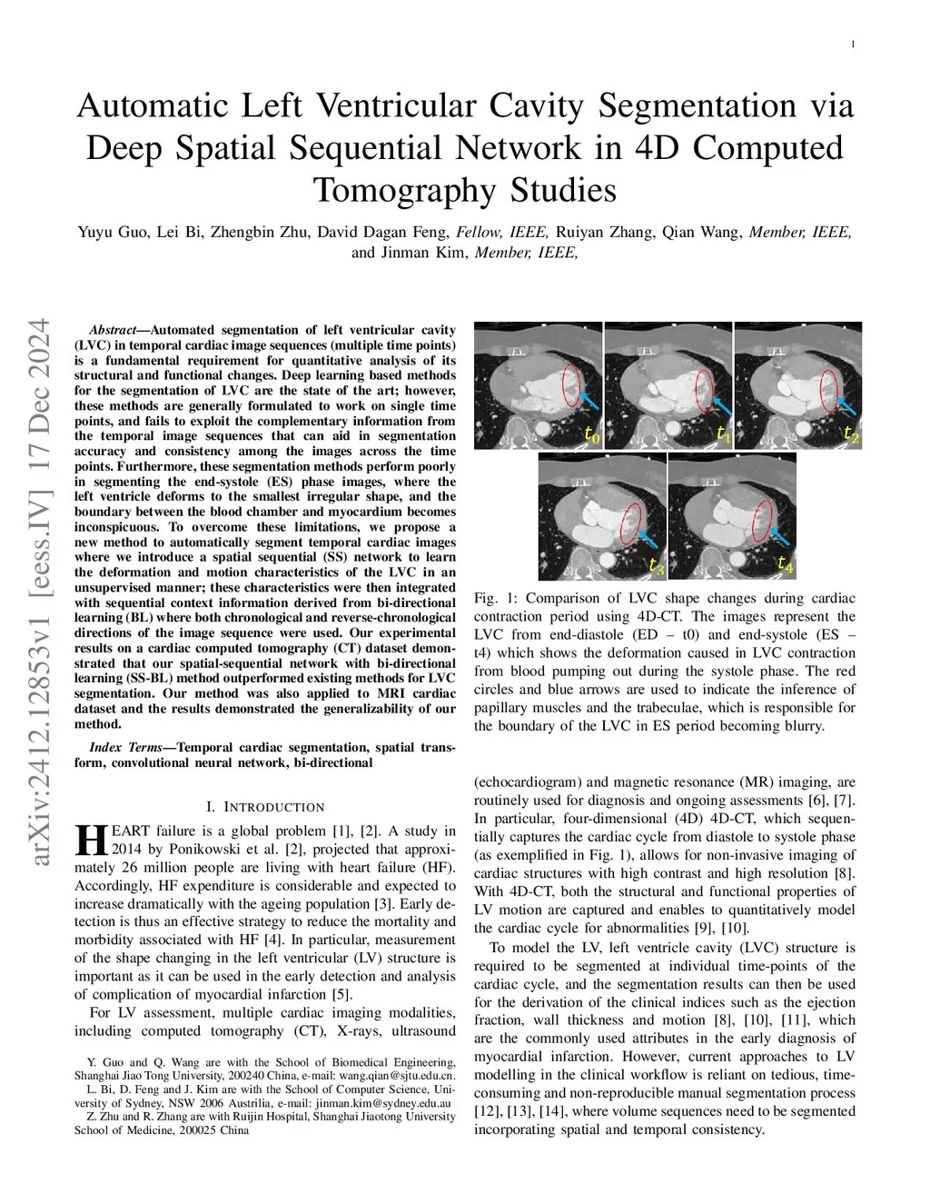 Automated segmentation of left ventricular cavity (LVC) in temporal cardiac image sequences (multiple time points) is a fundamental requirement for quantitative analysis of its structural and functional changes. Deep learning based methods for the segmentation of LVC are the state of the art; however, these methods are generally formulated to work on single time points, and fails to exploit the complementary information from the temporal image sequences that can aid in segmentation accuracy and consistency among the images across the time points. Furthermore, these segmentation methods perform poorly in segmenting the end-systole (ES) phase images, where the left ventricle deforms to the smallest irregular shape, and the boundary between the blood chamber and myocardium becomes inconspicuous. To overcome these limitations, we propose a new method to automatically segment temporal cardiac images where we introduce a spatial sequential (SS) network to learn the deformation and motion characteristics of the LVC in an unsupervised manner; these characteristics were then integrated with sequential context information derived from bi-directional learning (BL) where both chronological and reverse-chronological directions of the image sequence were used. Our experimental results on a cardiac computed tomography (CT) dataset demonstrated that our spatial-sequential network with bi-directional learning (SS-BL) method outperformed existing methods for LVC segmentation. Our method was also applied to MRI cardiac dataset and the results demonstrated the generalizability of our method.
