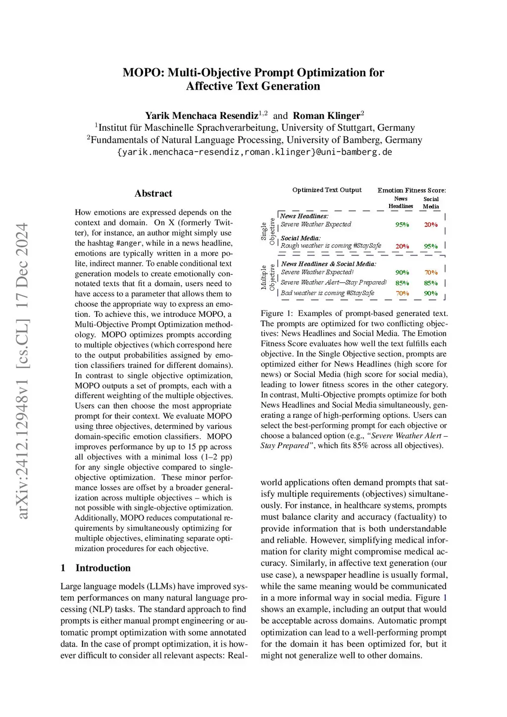 MOPO: Multi-Objective Prompt Optimization for Affective Text Generation