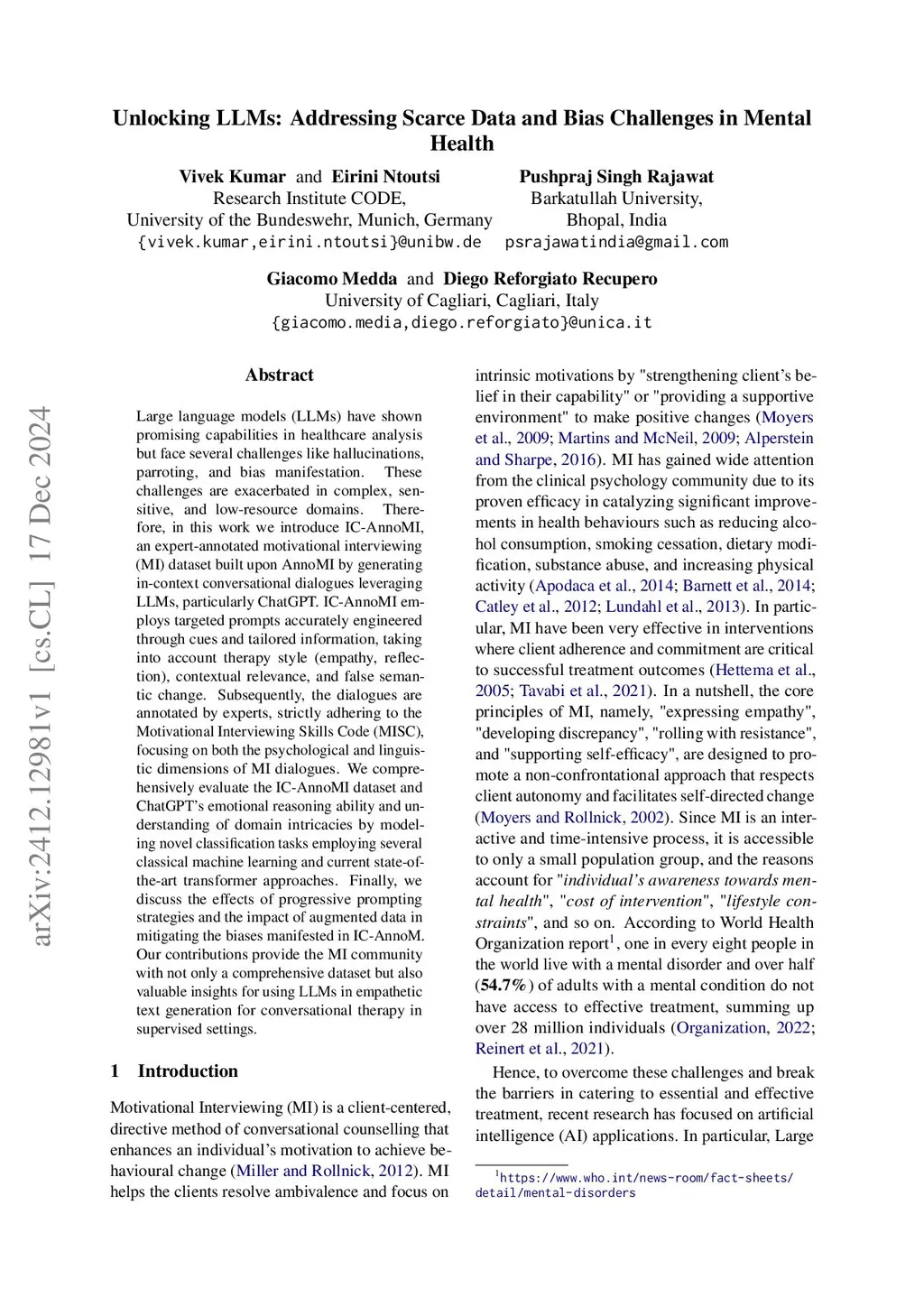 Large language models (LLMs) have shown promising capabilities in healthcare analysis but face several challenges like hallucinations, parroting, and bias manifestation. These challenges are exacerbated in complex, sensitive, and low-resource domains. Therefore, in this work we introduce IC-AnnoMI, an expert-annotated motivational interviewing (MI) dataset built upon AnnoMI by generating in-context conversational dialogues leveraging LLMs, particularly ChatGPT. IC-AnnoMI employs targeted prompts accurately engineered through cues and tailored information, taking into account therapy style (empathy, reflection), contextual relevance, and false semantic change. Subsequently, the dialogues are annotated by experts, strictly adhering to the Motivational Interviewing Skills Code (MISC), focusing on both the psychological and linguistic dimensions of MI dialogues. We comprehensively evaluate the IC-AnnoMI dataset and ChatGPT's emotional reasoning ability and understanding of domain intricacies by modeling novel classification tasks employing several classical machine learning and current state-of-the-art transformer approaches. Finally, we discuss the effects of progressive prompting strategies and the impact of augmented data in mitigating the biases manifested in IC-AnnoM. Our contributions provide the MI community with not only a comprehensive dataset but also valuable insights for using LLMs in empathetic text generation for conversational therapy in supervised settings.