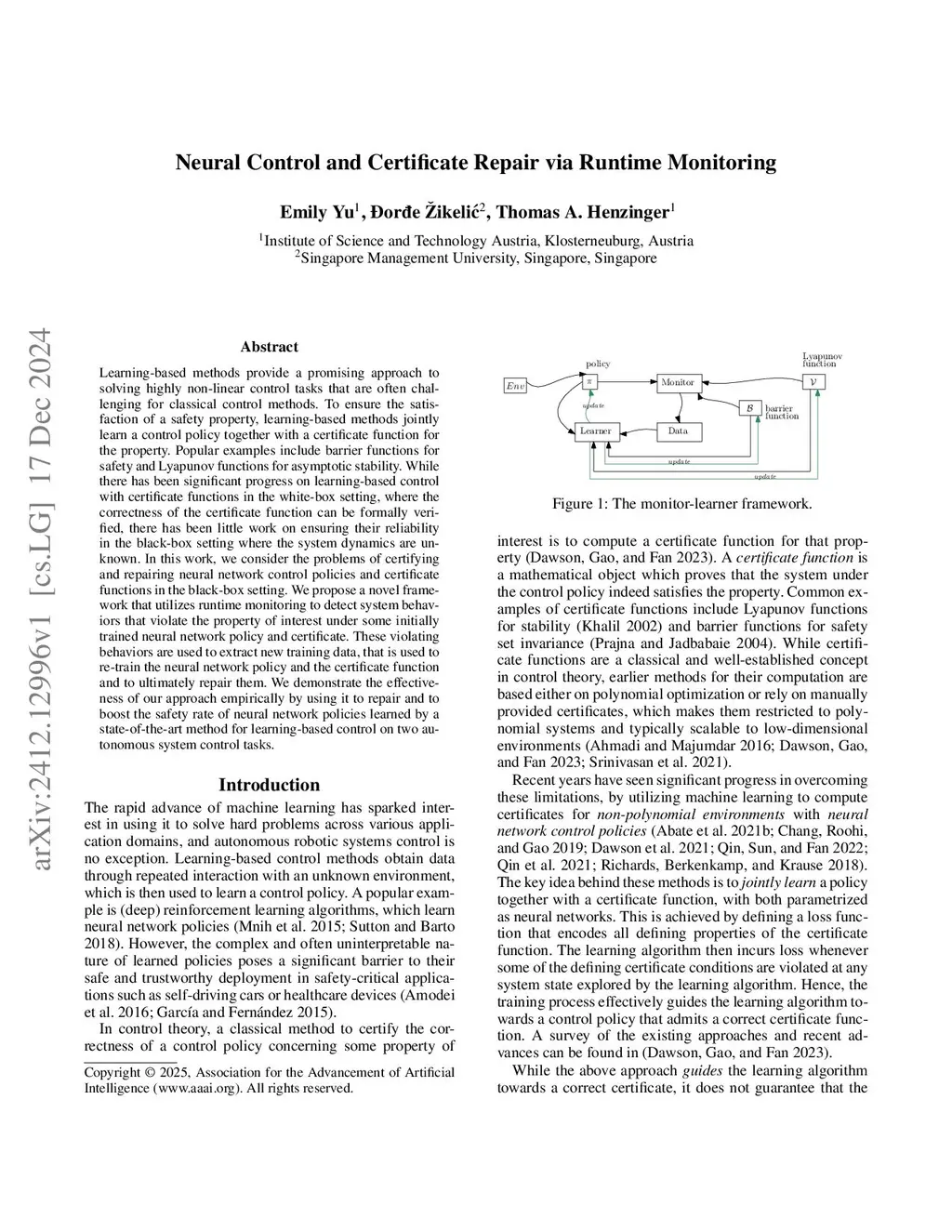 Neural Control and Certificate Repair via Runtime Monitoring
