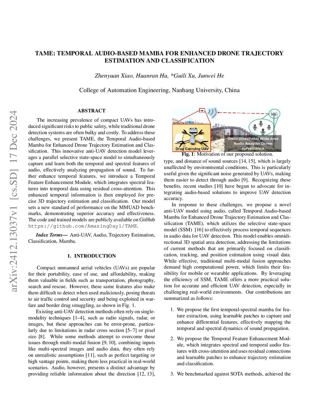 The increasing prevalence of compact UAVs has introduced significant risks to public safety, while traditional drone detection systems are often bulky and costly. To address these challenges, we present TAME, the Temporal Audio-based Mamba for Enhanced Drone Trajectory Estimation and Classification. This innovative anti-UAV detection model leverages a parallel selective state-space model to simultaneously capture and learn both the temporal and spectral features of audio, effectively analyzing propagation of sound. To further enhance temporal features, we introduce a Temporal Feature Enhancement Module, which integrates spectral features into temporal data using residual cross-attention. This enhanced temporal information is then employed for precise 3D trajectory estimation and classification. Our model sets a new standard of performance on the MMUAD benchmarks, demonstrating superior accuracy and effectiveness. The code and trained models are publicly available on GitHub \url{this https URL}.