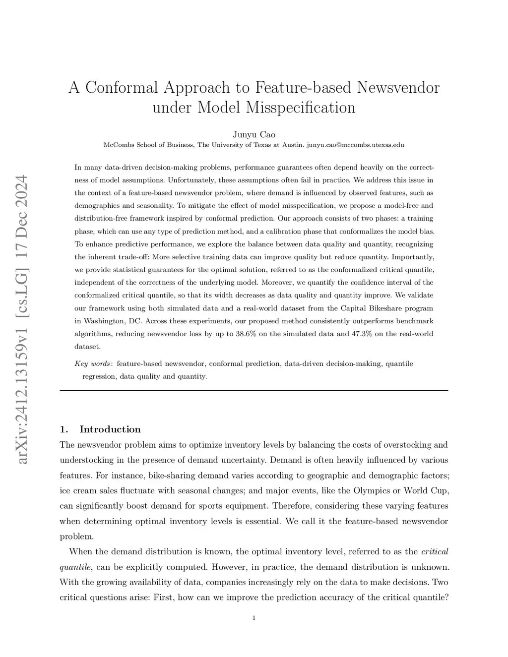 In many data-driven decision-making problems, performance guarantees often depend heavily on the correctness of model assumptions, which may frequently fail in practice. We address this issue in the context of a feature-based newsvendor problem, where demand is influenced by observed features such as demographics and seasonality. To mitigate the impact of model misspecification, we propose a model-free and distribution-free framework inspired by conformal prediction. Our approach consists of two phases: a training phase, which can utilize any type of prediction method, and a calibration phase that conformalizes the model bias. To enhance predictive performance, we explore the balance between data quality and quantity, recognizing the inherent trade-off: more selective training data improves quality but reduces quantity. Importantly, we provide statistical guarantees for the conformalized critical quantile, independent of the correctness of the underlying model. Moreover, we quantify the confidence interval of the critical quantile, with its width decreasing as data quality and quantity improve. We validate our framework using both simulated data and a real-world dataset from the Capital Bikeshare program in Washington, D.C. Across these experiments, our proposed method consistently outperforms benchmark algorithms, reducing newsvendor loss by up to 40% on the simulated data and 25% on the real-world dataset.