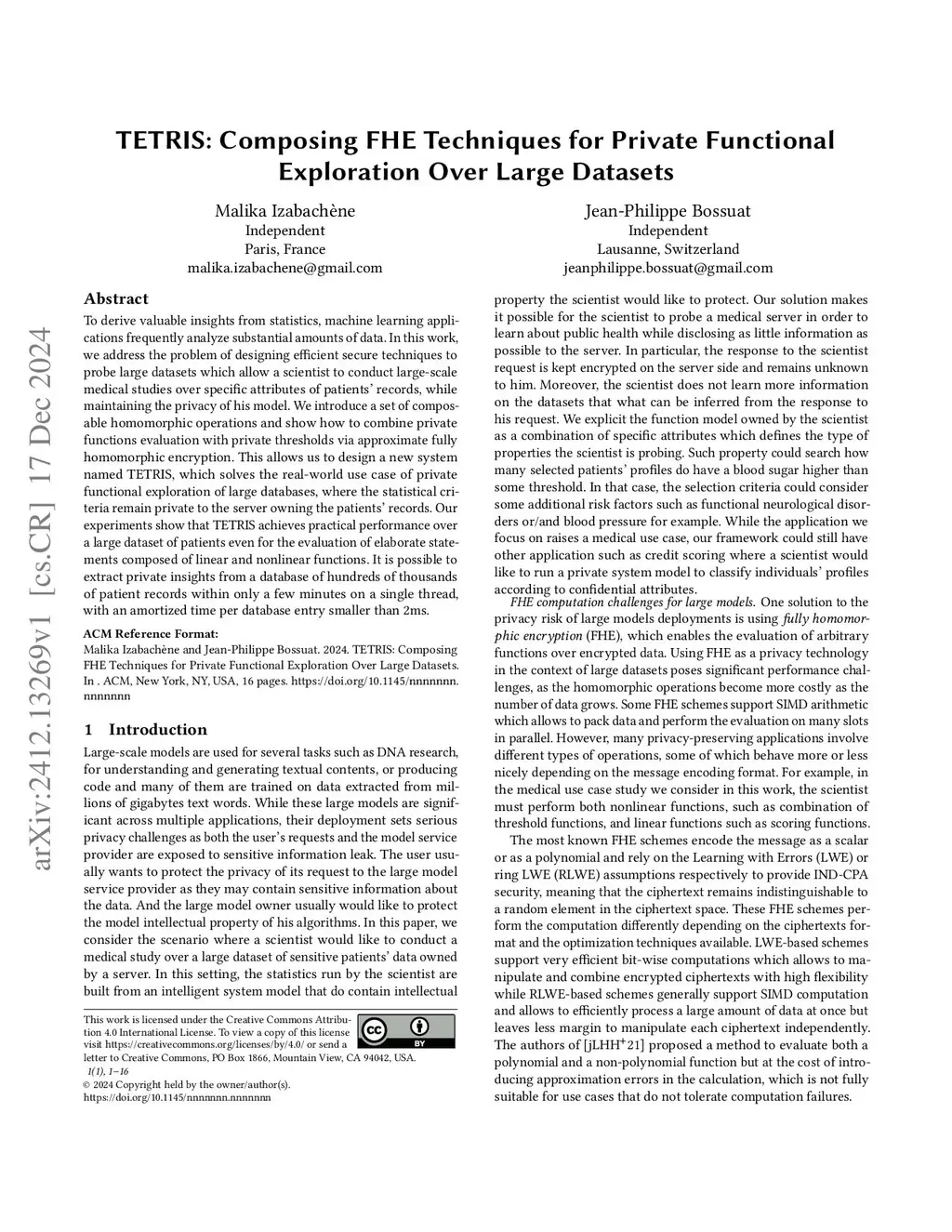 To derive valuable insights from statistics, machine learning applications frequently analyze substantial amounts of data. In this work, we address the problem of designing efficient secure techniques to probe large datasets which allow a scientist to conduct large-scale medical studies over specific attributes of patients' records, while maintaining the privacy of his model. We introduce a set of composable homomorphic operations and show how to combine private functions evaluation with private thresholds via approximate fully homomorphic encryption. This allows us to design a new system named TETRIS, which solves the real-world use case of private functional exploration of large databases, where the statistical criteria remain private to the server owning the patients' records. Our experiments show that TETRIS achieves practical performance over a large dataset of patients even for the evaluation of elaborate statements composed of linear and nonlinear functions. It is possible to extract private insights from a database of hundreds of thousands of patient records within only a few minutes on a single thread, with an amortized time per database entry smaller than 2ms.