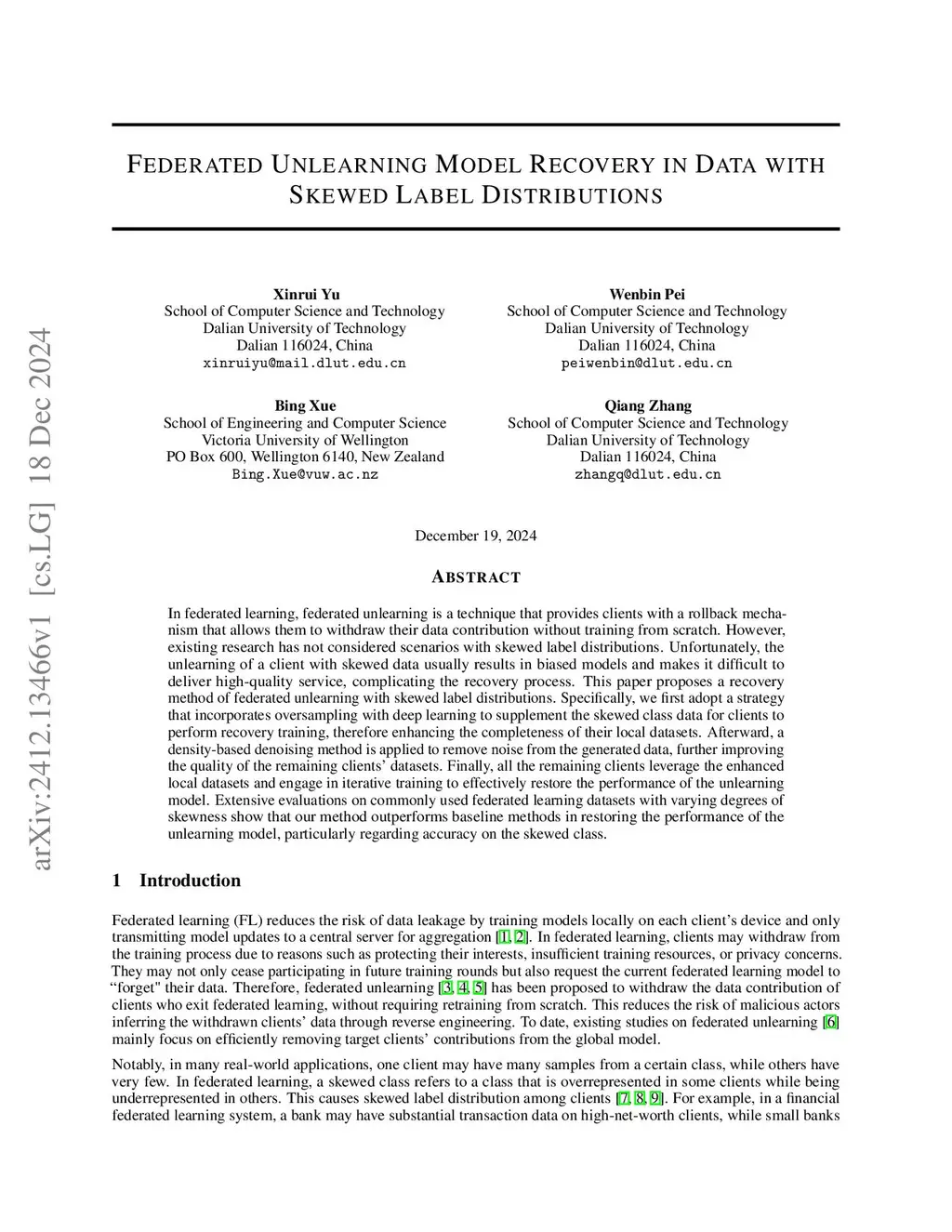 In federated learning, federated unlearning is a technique that provides clients with a rollback mechanism that allows them to withdraw their data contribution without training from scratch. However, existing research has not considered scenarios with skewed label distributions. Unfortunately, the unlearning of a client with skewed data usually results in biased models and makes it difficult to deliver high-quality service, complicating the recovery process. This paper proposes a recovery method of federated unlearning with skewed label distributions. Specifically, we first adopt a strategy that incorporates oversampling with deep learning to supplement the skewed class data for clients to perform recovery training, therefore enhancing the completeness of their local datasets. Afterward, a density-based denoising method is applied to remove noise from the generated data, further improving the quality of the remaining clients' datasets. Finally, all the remaining clients leverage the enhanced local datasets and engage in iterative training to effectively restore the performance of the unlearning model. Extensive evaluations on commonly used federated learning datasets with varying degrees of skewness show that our method outperforms baseline methods in restoring the performance of the unlearning model, particularly regarding accuracy on the skewed class.
