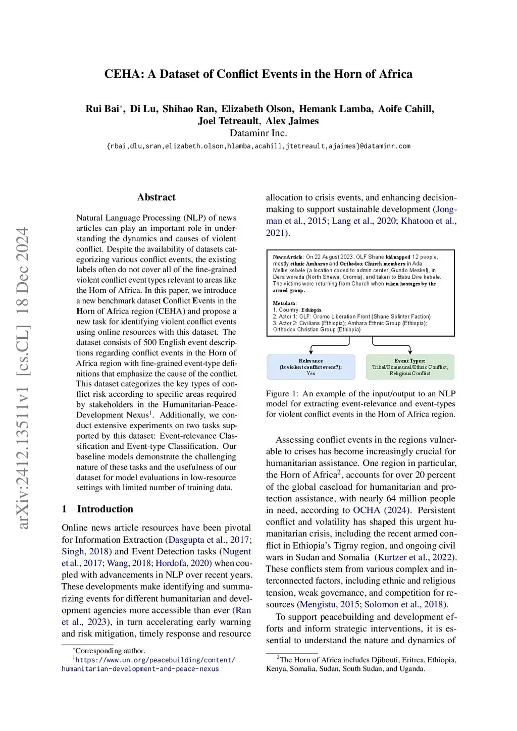 Natural Language Processing (NLP) of news articles can play an important role in understanding the dynamics and causes of violent conflict. Despite the availability of datasets categorizing various conflict events, the existing labels often do not cover all of the fine-grained violent conflict event types relevant to areas like the Horn of Africa. In this paper, we introduce a new benchmark dataset Conflict Events in the Horn of Africa region (CEHA) and propose a new task for identifying violent conflict events using online resources with this dataset. The dataset consists of 500 English event descriptions regarding conflict events in the Horn of Africa region with fine-grained event-type definitions that emphasize the cause of the conflict. This dataset categorizes the key types of conflict risk according to specific areas required by stakeholders in the Humanitarian-Peace-Development Nexus. Additionally, we conduct extensive experiments on two tasks supported by this dataset: Event-relevance Classification and Event-type Classification. Our baseline models demonstrate the challenging nature of these tasks and the usefulness of our dataset for model evaluations in low-resource settings with limited number of training data.