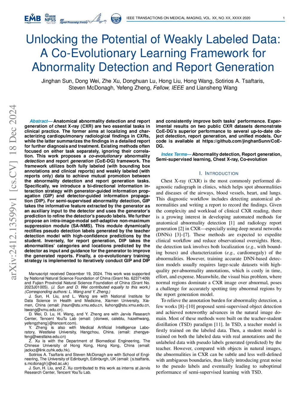 Anatomical abnormality detection and report generation of chest X-ray (CXR) are two essential tasks in clinical practice. The former aims at localizing and characterizing cardiopulmonary radiological findings in CXRs, while the latter summarizes the findings in a detailed report for further diagnosis and treatment. Existing methods often focused on either task separately, ignoring their correlation. This work proposes a co-evolutionary abnormality detection and report generation (CoE-DG) framework. The framework utilizes both fully labeled (with bounding box annotations and clinical reports) and weakly labeled (with reports only) data to achieve mutual promotion between the abnormality detection and report generation tasks. Specifically, we introduce a bi-directional information interaction strategy with generator-guided information propagation (GIP) and detector-guided information propagation (DIP). For semi-supervised abnormality detection, GIP takes the informative feature extracted by the generator as an auxiliary input to the detector and uses the generator's prediction to refine the detector's pseudo labels. We further propose an intra-image-modal self-adaptive non-maximum suppression module (SA-NMS). This module dynamically rectifies pseudo detection labels generated by the teacher detection model with high-confidence predictions by the student.Inversely, for report generation, DIP takes the abnormalities' categories and locations predicted by the detector as input and guidance for the generator to improve the generated reports.