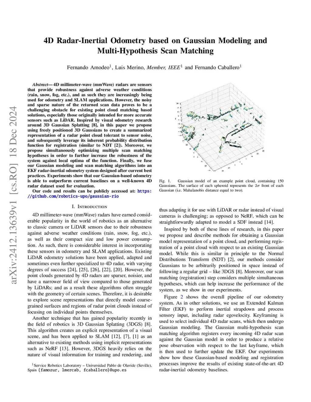 4D millimeter-wave (mmWave) radars are sensors that provide robustness against adverse weather conditions (rain, snow, fog, etc.), and as such they are increasingly used for odometry and SLAM (Simultaneous Location and Mapping). However, the noisy and sparse nature of the returned scan data proves to be a challenging obstacle for existing registration algorithms, especially those originally intended for more accurate sensors such as LiDAR. Following the success of 3D Gaussian Splatting for vision, in this paper we propose a summarized representation for radar scenes based on global simultaneous optimization of 3D Gaussians as opposed to voxel-based approaches, and leveraging its inherent Probability Density Function (PDF) for registration. Moreover, we propose tackling the problem of radar noise entirely within the scan matching process by optimizing multiple registration hypotheses for better protection against local optima of the PDF. Finally, following existing practice we implement an Extended Kalman Filter-based Radar-Inertial Odometry pipeline in order to evaluate the effectiveness of our system. Experiments using publicly available 4D radar datasets show that our Gaussian approach is comparable to existing registration algorithms, outperforming them in several sequences.