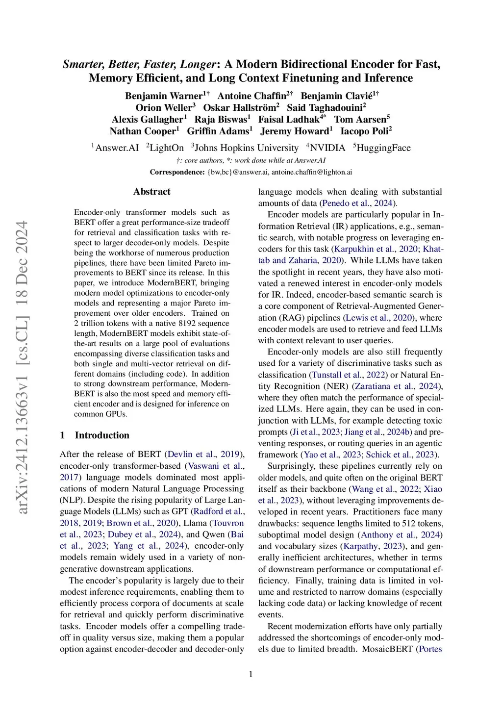 Encoder-only transformer models such as BERT offer a great performance-size tradeoff for retrieval and classification tasks with respect to larger decoder-only models. Despite being the workhorse of numerous production pipelines, there have been limited Pareto improvements to BERT since its release. In this paper, we introduce ModernBERT, bringing modern model optimizations to encoder-only models and representing a major Pareto improvement over older encoders. Trained on 2 trillion tokens with a native 8192 sequence length, ModernBERT models exhibit state-of-the-art results on a large pool of evaluations encompassing diverse classification tasks and both single and multi-vector retrieval on different domains (including code). In addition to strong downstream performance, ModernBERT is also the most speed and memory efficient encoder and is designed for inference on common GPUs.