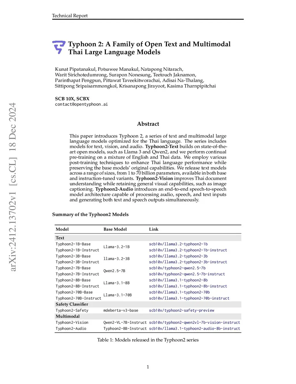 This paper introduces Typhoon 2, a series of text and multimodal large language models optimized for the Thai language. The series includes models for text, vision, and audio. Typhoon2-Text builds on state-of-the-art open models, such as Llama 3 and Qwen2, and we perform continual pre-training on a mixture of English and Thai data. We employ post-training techniques to enhance Thai language performance while preserving the base models' original capabilities. We release text models across a range of sizes, from 1 to 70 billion parameters, available in both base and instruction-tuned variants. To guardrail text generation, we release Typhoon2-Safety, a classifier enhanced for Thai cultures and language. Typhoon2-Vision improves Thai document understanding while retaining general visual capabilities, such as image captioning. Typhoon2-Audio introduces an end-to-end speech-to-speech model architecture capable of processing audio, speech, and text inputs and generating both text and speech outputs.