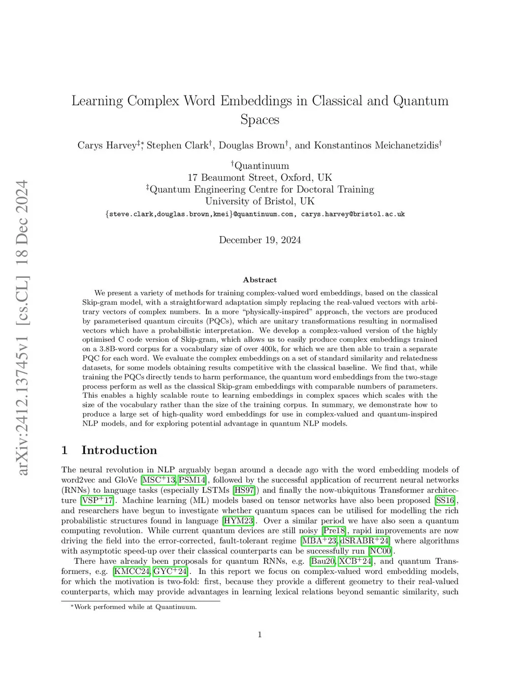 We present a variety of methods for training complex-valued word embeddings, based on the classical Skip-gram model, with a straightforward adaptation simply replacing the real-valued vectors with arbitrary vectors of complex numbers. In a more "physically-inspired" approach, the vectors are produced by parameterised quantum circuits (PQCs), which are unitary transformations resulting in normalised vectors which have a probabilistic interpretation. We develop a complex-valued version of the highly optimised C code version of Skip-gram, which allows us to easily produce complex embeddings trained on a 3.8B-word corpus for a vocabulary size of over 400k, for which we are then able to train a separate PQC for each word. We evaluate the complex embeddings on a set of standard similarity and relatedness datasets, for some models obtaining results competitive with the classical baseline. We find that, while training the PQCs directly tends to harm performance, the quantum word embeddings from the two-stage process perform as well as the classical Skip-gram embeddings with comparable numbers of parameters. This enables a highly scalable route to learning embeddings in complex spaces which scales with the size of the vocabulary rather than the size of the training corpus. In summary, we demonstrate how to produce a large set of high-quality word embeddings for use in complex-valued and quantum-inspired NLP models, and for exploring potential advantage in quantum NLP models.
