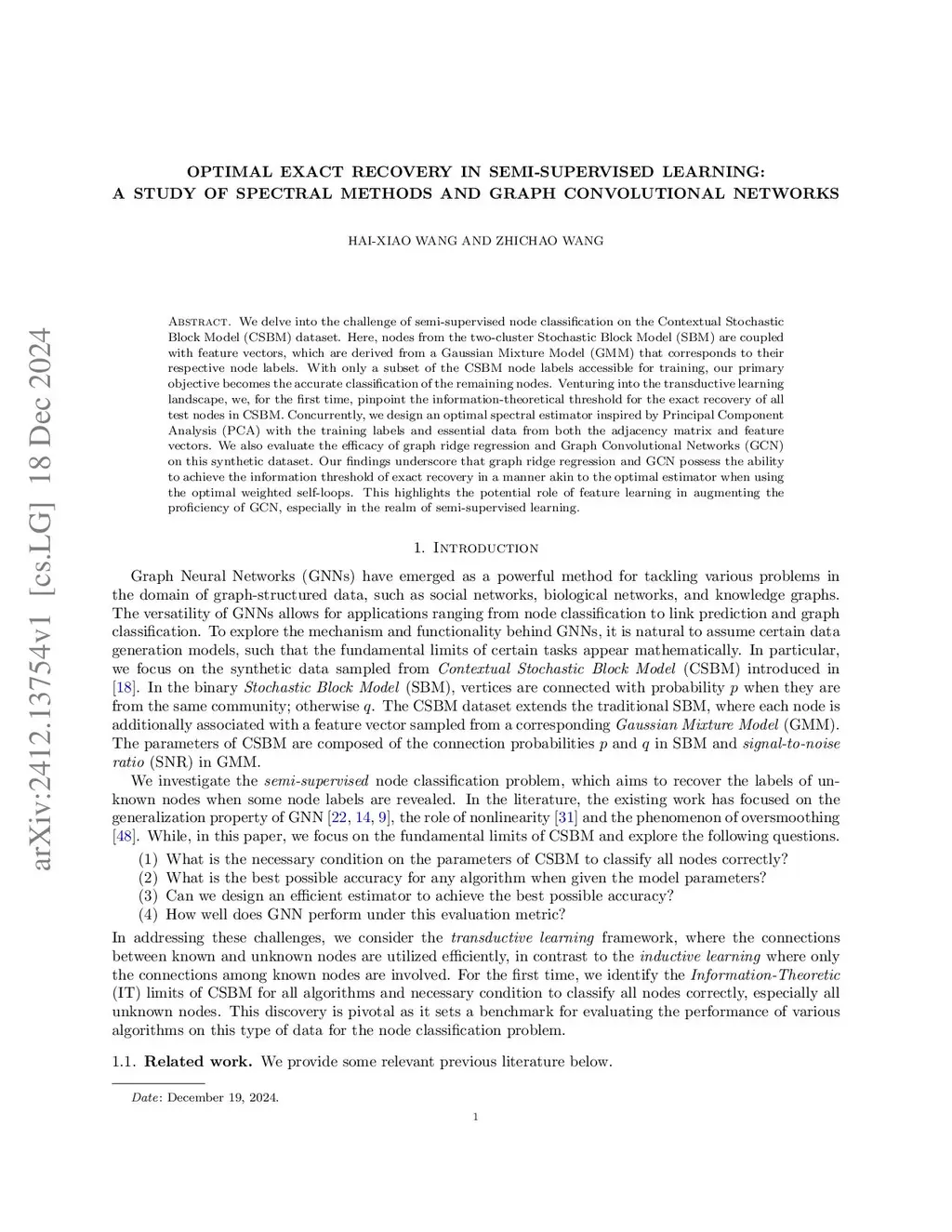 We delve into the challenge of semi-supervised node classification on the Contextual Stochastic Block Model (CSBM) dataset. Here, nodes from the two-cluster Stochastic Block Model (SBM) are coupled with feature vectors, which are derived from a Gaussian Mixture Model (GMM) that corresponds to their respective node labels. With only a subset of the CSBM node labels accessible for training, our primary objective becomes the accurate classification of the remaining nodes. Venturing into the transductive learning landscape, we, for the first time, pinpoint the information-theoretical threshold for the exact recovery of all test nodes in CSBM. Concurrently, we design an optimal spectral estimator inspired by Principal Component Analysis (PCA) with the training labels and essential data from both the adjacency matrix and feature vectors. We also evaluate the efficacy of graph ridge regression and Graph Convolutional Networks (GCN) on this synthetic dataset. Our findings underscore that graph ridge regression and GCN possess the ability to achieve the information threshold of exact recovery in a manner akin to the optimal estimator when using the optimal weighted self-loops. This highlights the potential role of feature learning in augmenting the proficiency of GCN, especially in the realm of semi-supervised learning.