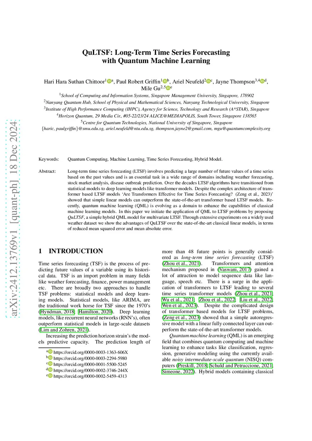 Long-term time series forecasting (LTSF) involves predicting a large number of future values of a time series based on the past values. This is an essential task in a wide range of domains including weather forecasting, stock market analysis and disease outbreak prediction. Over the decades LTSF algorithms have transitioned from statistical models to deep learning models like transformer models. Despite the complex architecture of transformer based LTSF models `Are Transformers Effective for Time Series Forecasting? (Zeng et al., 2023)' showed that simple linear models can outperform the state-of-the-art transformer based LTSF models. Recently, quantum machine learning (QML) is evolving as a domain to enhance the capabilities of classical machine learning models. In this paper we initiate the application of QML to LTSF problems by proposing QuLTSF, a simple hybrid QML model for multivariate LTSF. Through extensive experiments on a widely used weather dataset we show the advantages of QuLTSF over the state-of-the-art classical linear models, in terms of reduced mean squared error and mean absolute error.