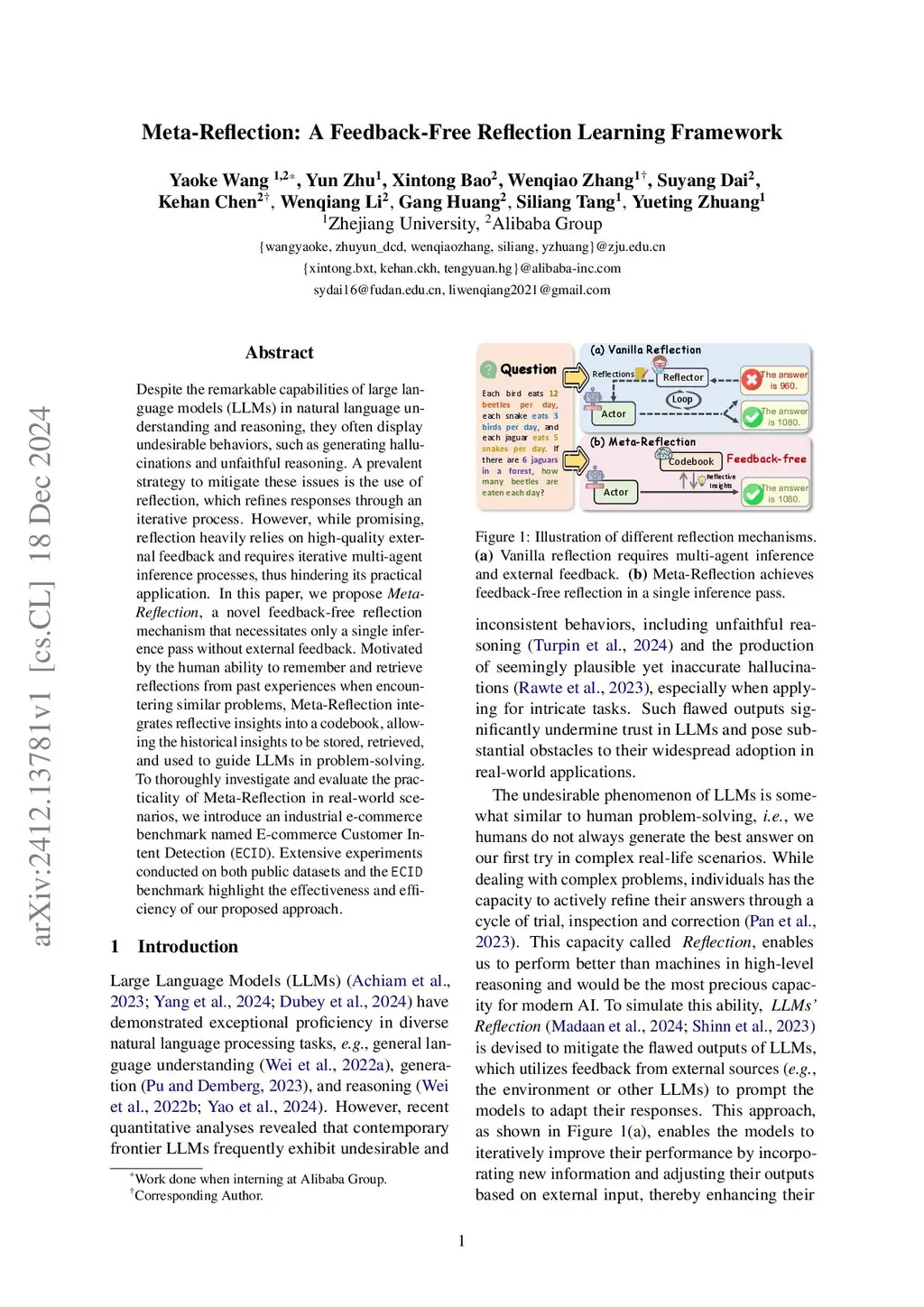 Despite the remarkable capabilities of large language models (LLMs) in natural language understanding and reasoning, they often display undesirable behaviors, such as generating hallucinations and unfaithful reasoning. A prevalent strategy to mitigate these issues is the use of reflection, which refines responses through an iterative process. However, while promising, reflection heavily relies on high-quality external feedback and requires iterative multi-agent inference processes, thus hindering its practical application. In this paper, we propose Meta-Reflection, a novel feedback-free reflection mechanism that necessitates only a single inference pass without external feedback. Motivated by the human ability to remember and retrieve reflections from past experiences when encountering similar problems, Meta-Reflection integrates reflective insights into a codebook, allowing the historical insights to be stored, retrieved, and used to guide LLMs in problem-solving. To thoroughly investigate and evaluate the practicality of Meta-Reflection in real-world scenarios, we introduce an industrial e-commerce benchmark named E-commerce Customer Intent Detection (ECID). Extensive experiments conducted on both public datasets and the ECID benchmark highlight the effectiveness and efficiency of our proposed approach.