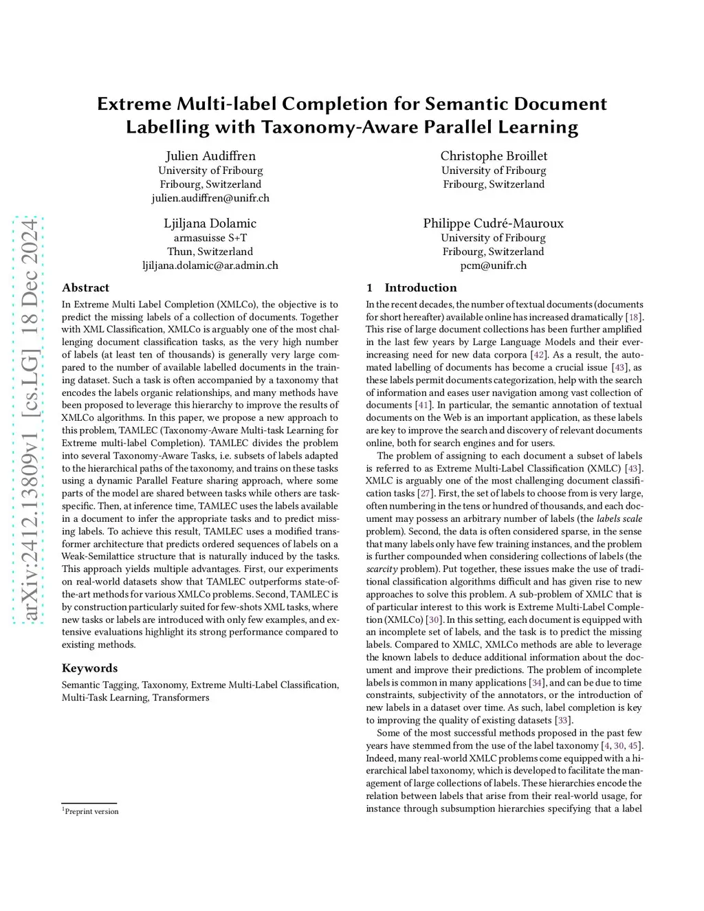 In Extreme Multi Label Completion (XMLCo), the objective is to predict the missing labels of a collection of documents. Together with XML Classification, XMLCo is arguably one of the most challenging document classification tasks, as the very high number of labels (at least ten of thousands) is generally very large compared to the number of available labelled documents in the training dataset. Such a task is often accompanied by a taxonomy that encodes the labels organic relationships, and many methods have been proposed to leverage this hierarchy to improve the results of XMLCo algorithms. In this paper, we propose a new approach to this problem, TAMLEC (Taxonomy-Aware Multi-task Learning for Extreme multi-label Completion). TAMLEC divides the problem into several Taxonomy-Aware Tasks, i.e. subsets of labels adapted to the hierarchical paths of the taxonomy, and trains on these tasks using a dynamic Parallel Feature sharing approach, where some parts of the model are shared between tasks while others are task-specific. Then, at inference time, TAMLEC uses the labels available in a document to infer the appropriate tasks and to predict missing labels. To achieve this result, TAMLEC uses a modified transformer architecture that predicts ordered sequences of labels on a Weak-Semilattice structure that is naturally induced by the tasks. This approach yields multiple advantages. First, our experiments on real-world datasets show that TAMLEC outperforms state-of-the-art methods for various XMLCo problems. Second, TAMLEC is by construction particularly suited for few-shots XML tasks, where new tasks or labels are introduced with only few examples, and extensive evaluations highlight its strong performance compared to existing methods.